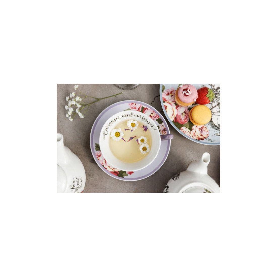Filiżanka i spodek porcelanowe z kolekcji Mikasa & V&A "Alicja w Krainie Czarów" o pojemności 140 ml to elegancki zestaw ozdobiony misternymi ilustracjami w pastelowych kolorach, które nawiązują do motywów z książki o Alicji. Wykonane z porcelany kostnej, filiżanka i spodek łączą elegancję z funkcjonalnością. Nadają się do mycia w zmywarce oraz używania w kuchence mikrofalowej.Odkryj wszystko, czego potrzebujesz, aby przygotować herbatę, która zrobi wrażenie.