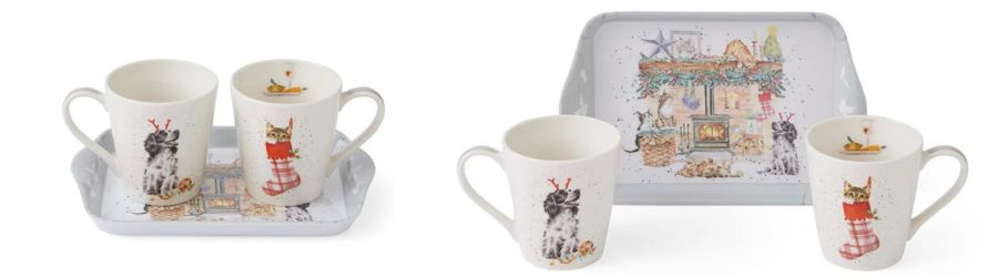 Idą Święta – zestaw kubków z tacką przedstawia urokliwą scenę zwierząt zgromadzonych przy kominku udekorowanym na święta. To przytulny, nastrojowy komplet stworzony do wspólnych chwil przy herbacie lub kakao. Od razu wprowadza atmosferę nadchodzących świąt.