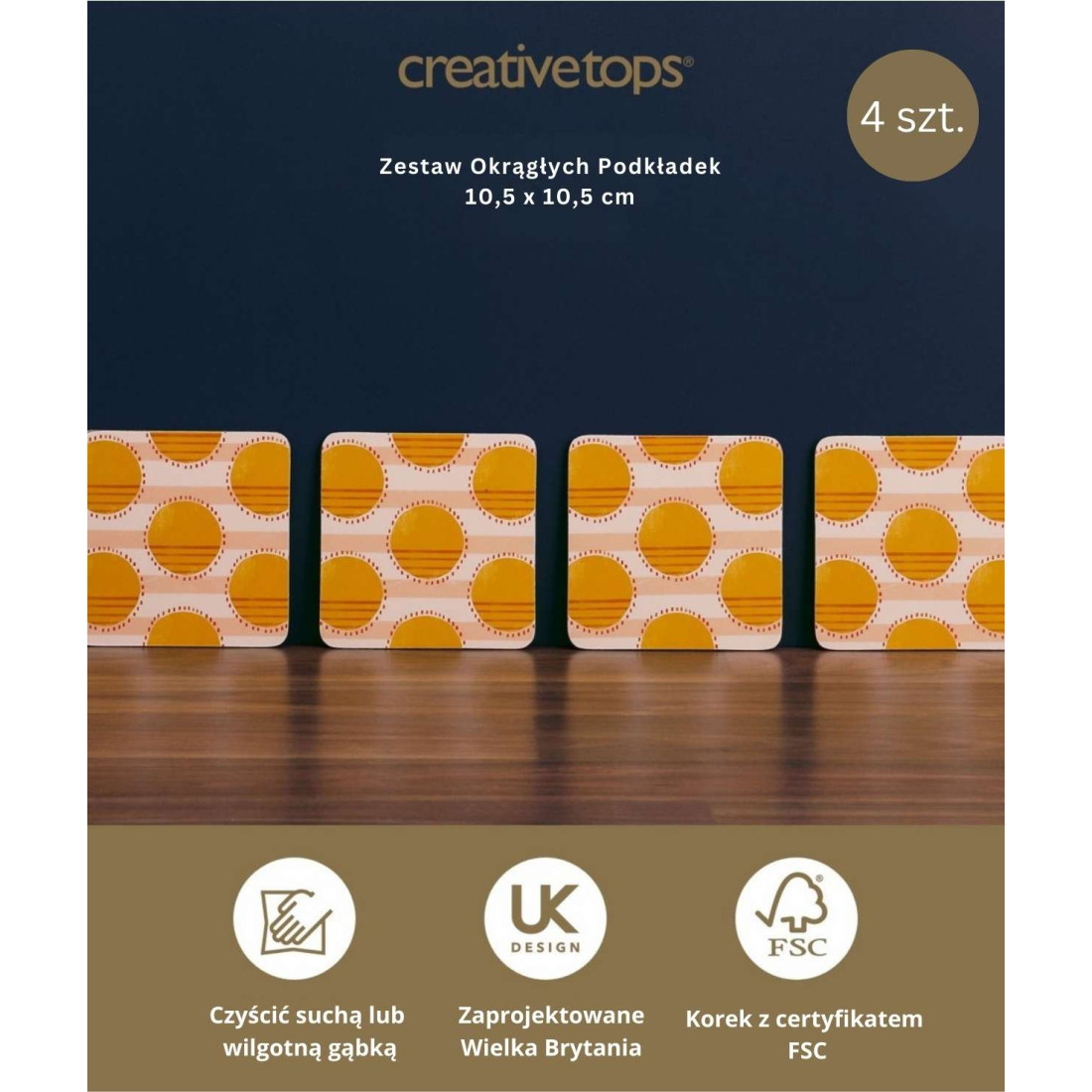 Zestaw 4 podkładek małych marki Creative Tops został zaprojektowany, aby chronić stoły, oferując jednocześnie żywy i stylowy akcent. Dzięki pięknym i żywym nadrukom oraz wytrzymałemu korkowemu podłożu, podstawki te są praktycznym i szykownym dodatkiem do wystroju. Chronią powierzchnie przed gorącymi kubkami, szklankami lub filiżankami. Zaprojektowane w Wielkiej Brytanii, łączą styl z funkcjonalnością, aby rozjaśnić każde otoczenie.