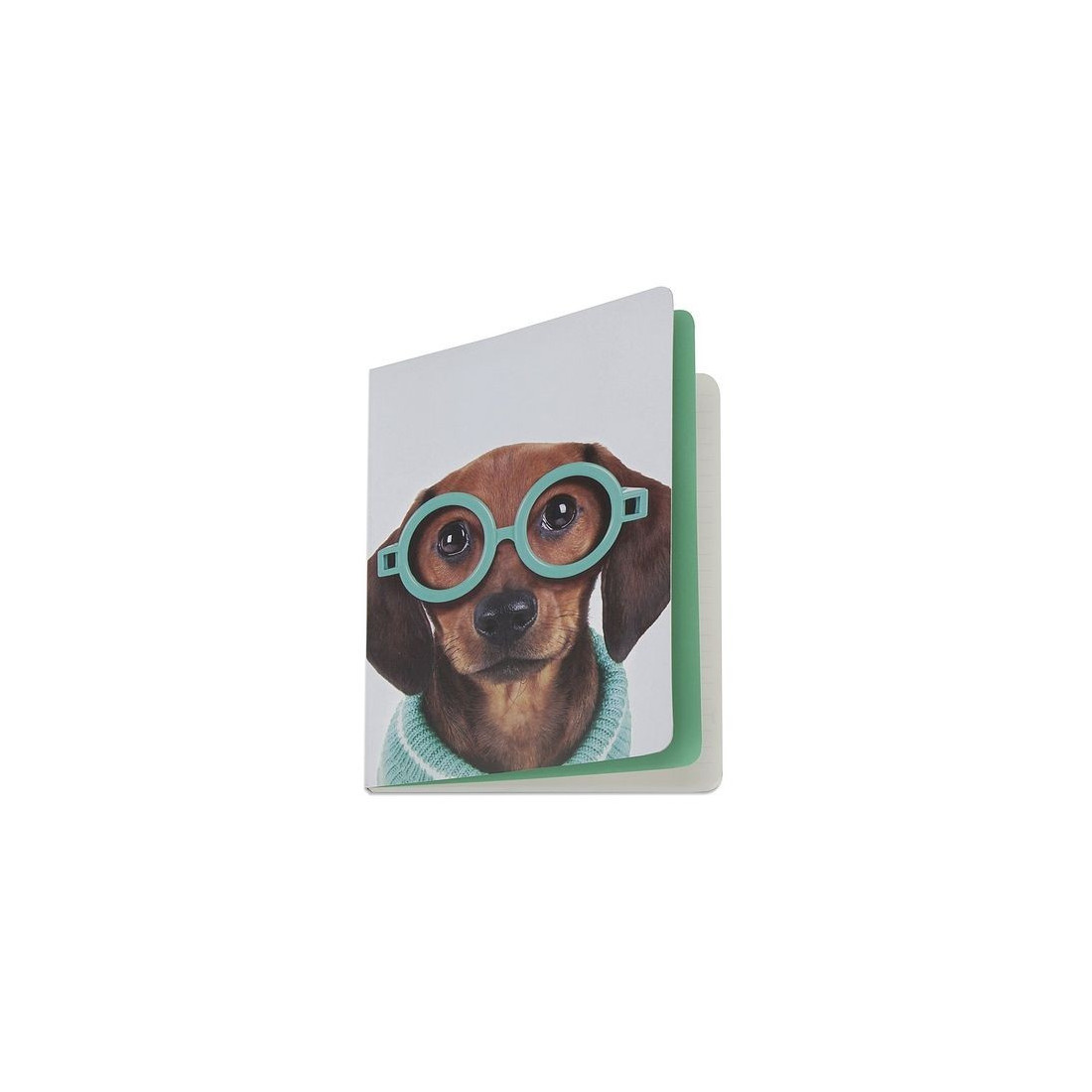 Poręczny notatnik w formacie: A6 o wymiarach: 20 x 12.5 x 1 cm. Ozdobiony atrakcyjnym nadrukiem przedstawiającym sympatycznego jamnika w golfie i zielonych okularach.
