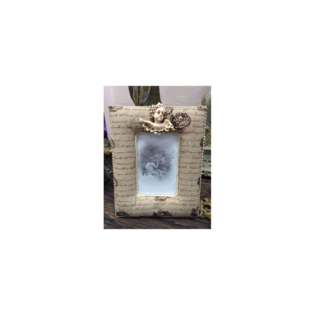 Ramka stojąca ozdobiona barokowym cherubinkiem. Przeznaczona do oprawy fotografii, będzie stanowić znakomitą ozdobę dowolnego wnętrza. Wykonana jest z wysokiej jakości tworzywa i materiału.