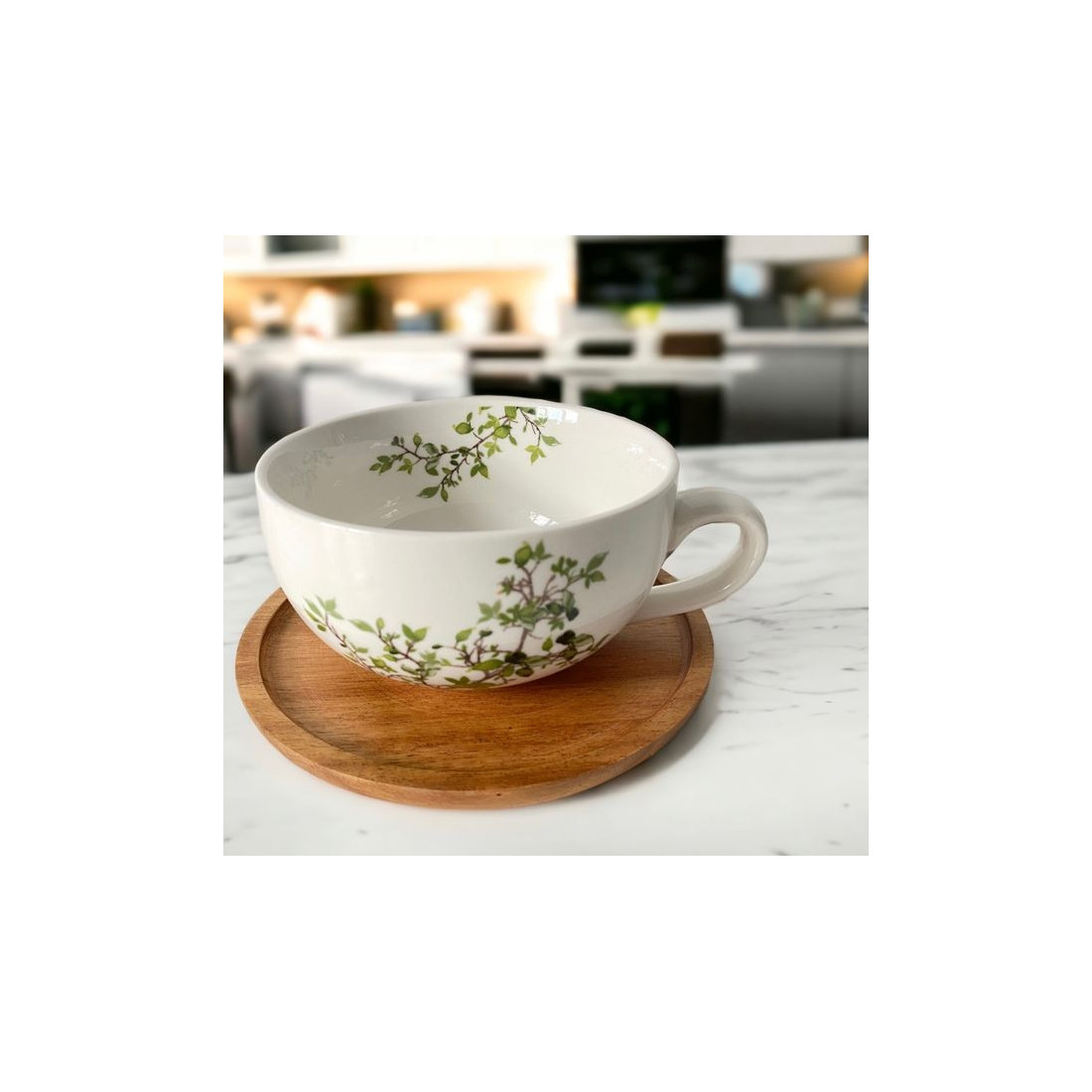 Filiżanka porcelanowa z drewnianą przykrywką marki Easy Life, ozdobiona delikatnym motywem roślinnym, to doskonały dodatek do każdej kolekcji zastawy stołowej, który możesz podarować sobie lub bliskiej osobie. Przykrywka z drewna akacjowego pełni podwójną funkcję – ułatwia zaparzenie aromatycznego naparu, a następnie chroni powierzchnię stołu przed śladami po gorącym naczyniu. Wykonana z porcelany najwyższej jakości, łączy elegancję z praktycznością, stając się wyjątkowym elementem dekoracyjnym oraz doskonałym pomysłem na prezent.