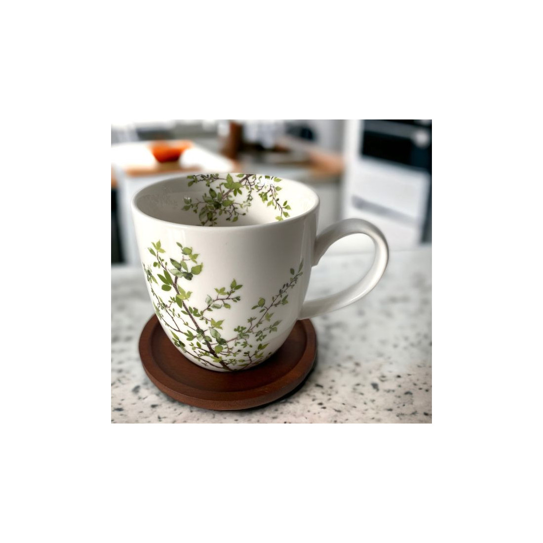 Kubek porcelanowy z drewnianą przykrywką marki Easy Life, ozdobiony delikatnym motywem roślinnym, to doskonały dodatek do każdej kolekcji zastawy stołowej, który możesz podarować sobie lub bliskiej osobie. Przykrywka z drewna akacjowego pełni podwójną funkcję – ułatwia zaparzenie aromatycznego naparu, a następnie chroni powierzchnię stołu przed śladami po gorącym naczyniu. Wykonany z porcelany najwyższej jakości, łączy elegancję z praktycznością, stając się wyjątkowym elementem dekoracyjnym oraz doskonałym pomysłem na prezent.
