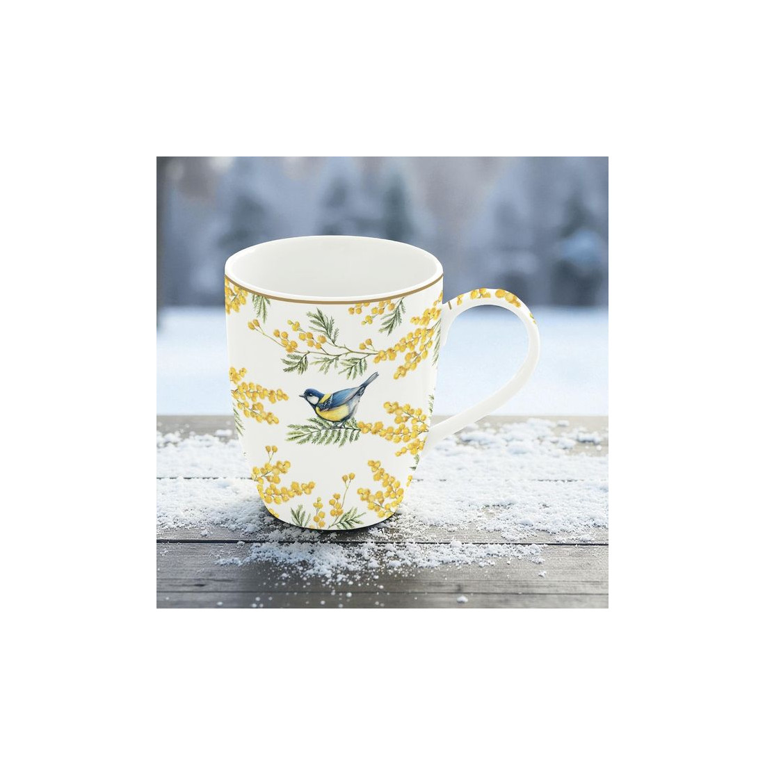Porcelanowy kubek z kolekcji Mimosa we wzór w sikorki to elegancki wybór dla miłośników delikatnych, kwiatowych motywów.