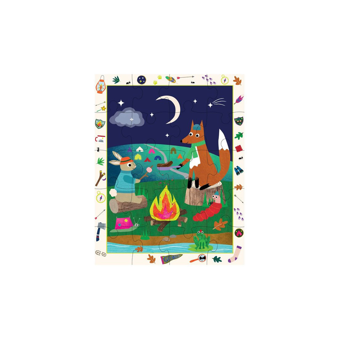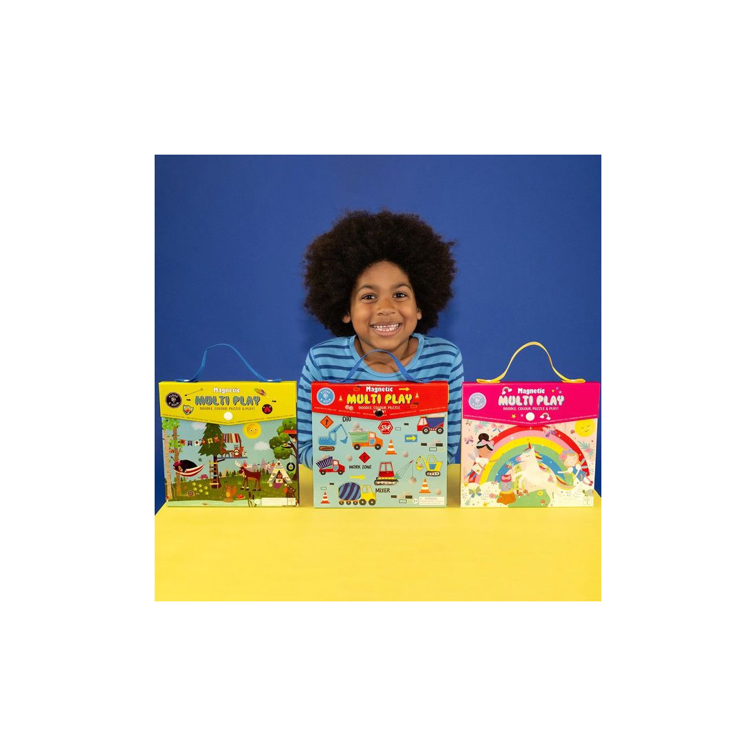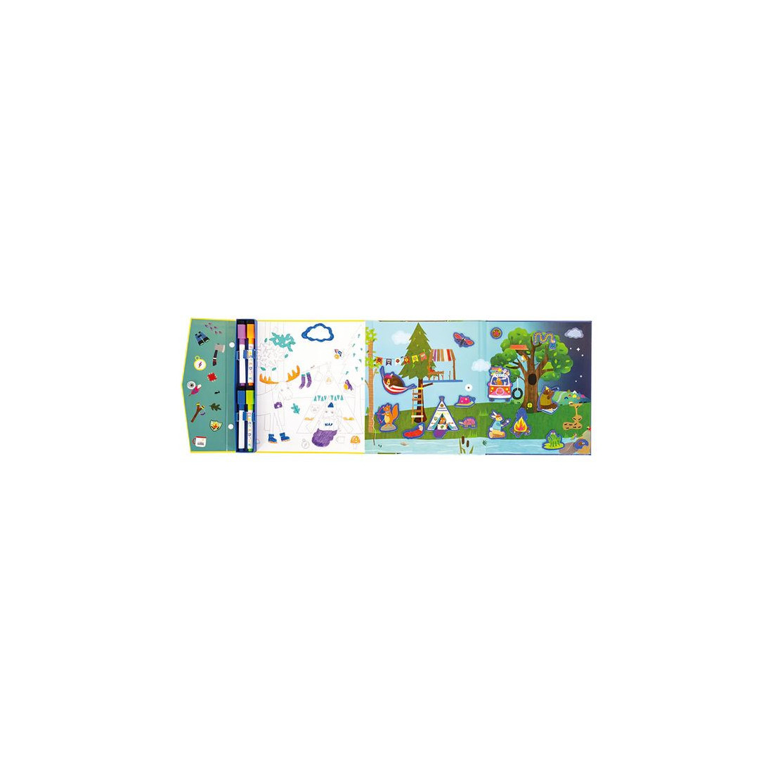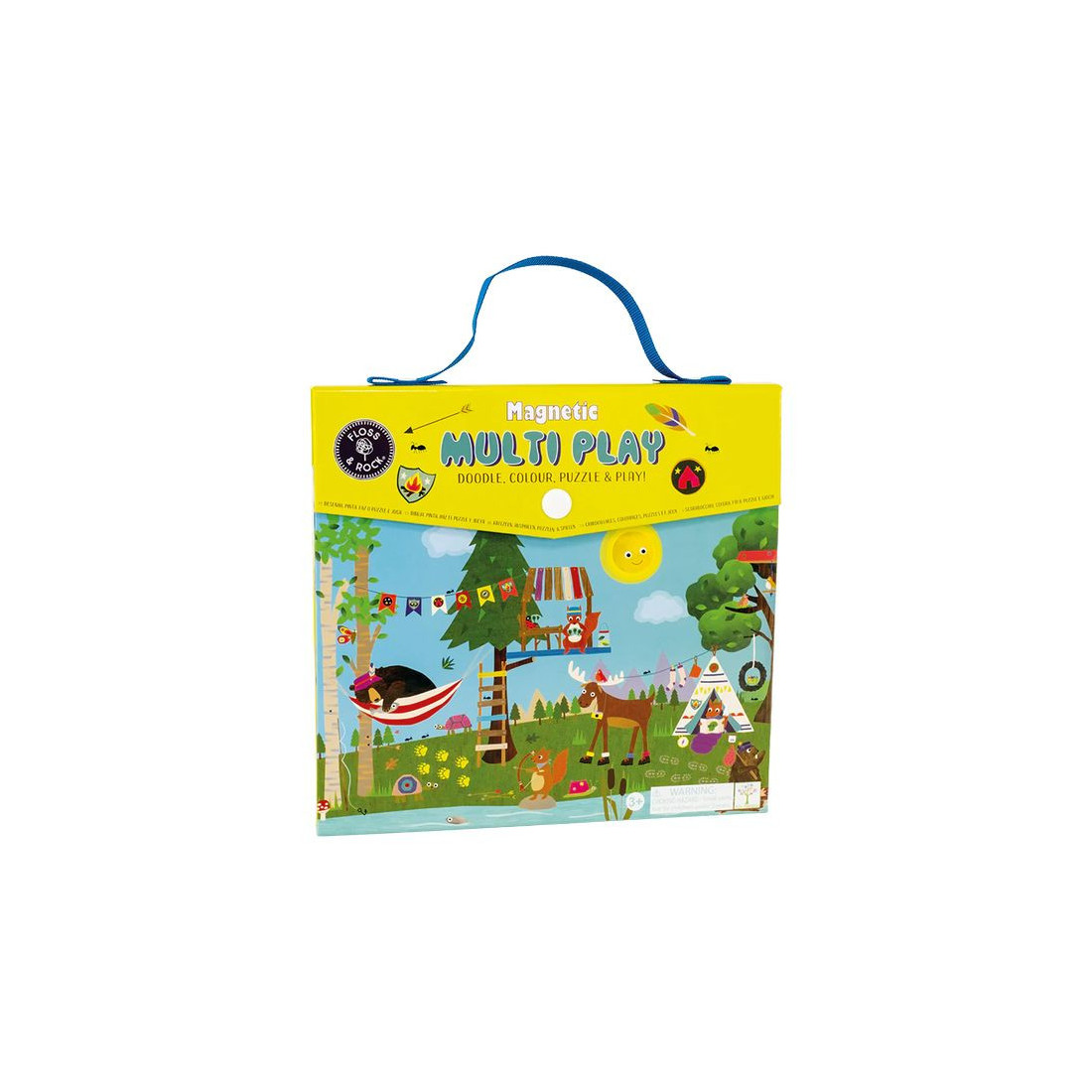 Układaj puzzle, rysuj, koloruj i baw się! Zestaw Magnetyczny Przygoda to cztery lubiane i popularne zabawy w jednym pudełku, które gwarantują dzieciom świetną i kreatywną zabawę na wiele godzin. Po rozłożeniu zestawu odsłania się atrakcyjną układankę składającą się z 20 magnetycznych elementów, 4 kolorowe pisaki z gumkami do wycierania na sucho oraz plansze do rysowania i pisania. Zestaw zawiera także magnetycznego łosia, niedźwiedzia obserwującego gwiazdy, wiewiórkę grającą w karty oraz ptaki, owady i żaby, co umożliwia niekończącą się zabawę na planszy magnetycznej. Pudełko składa się na płasko i jest wyposażone w poręczny uchwyt do przenoszenia, dzięki czemu idealnie sprawdza się w podróży oraz do zabawy na świeżym powietrzu.