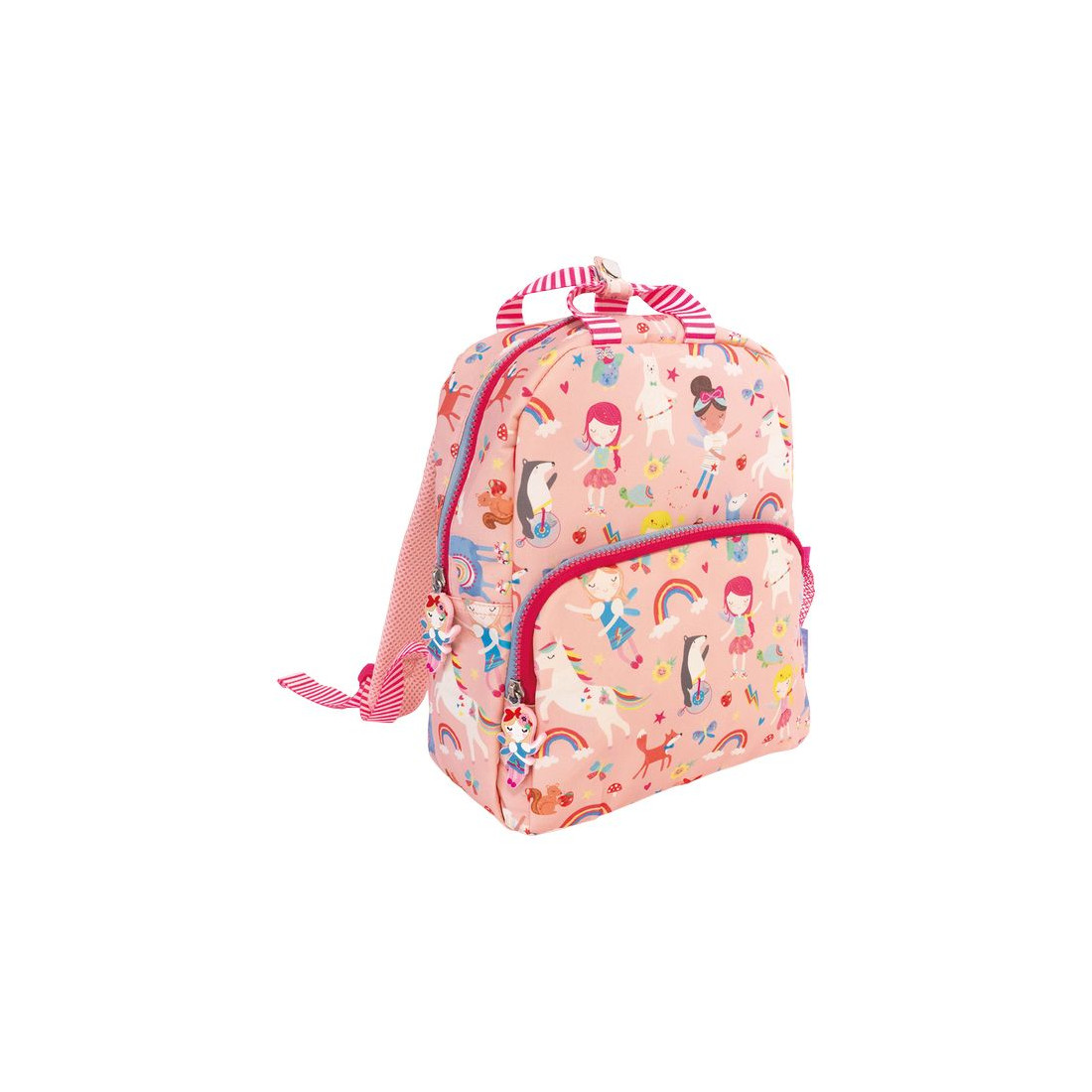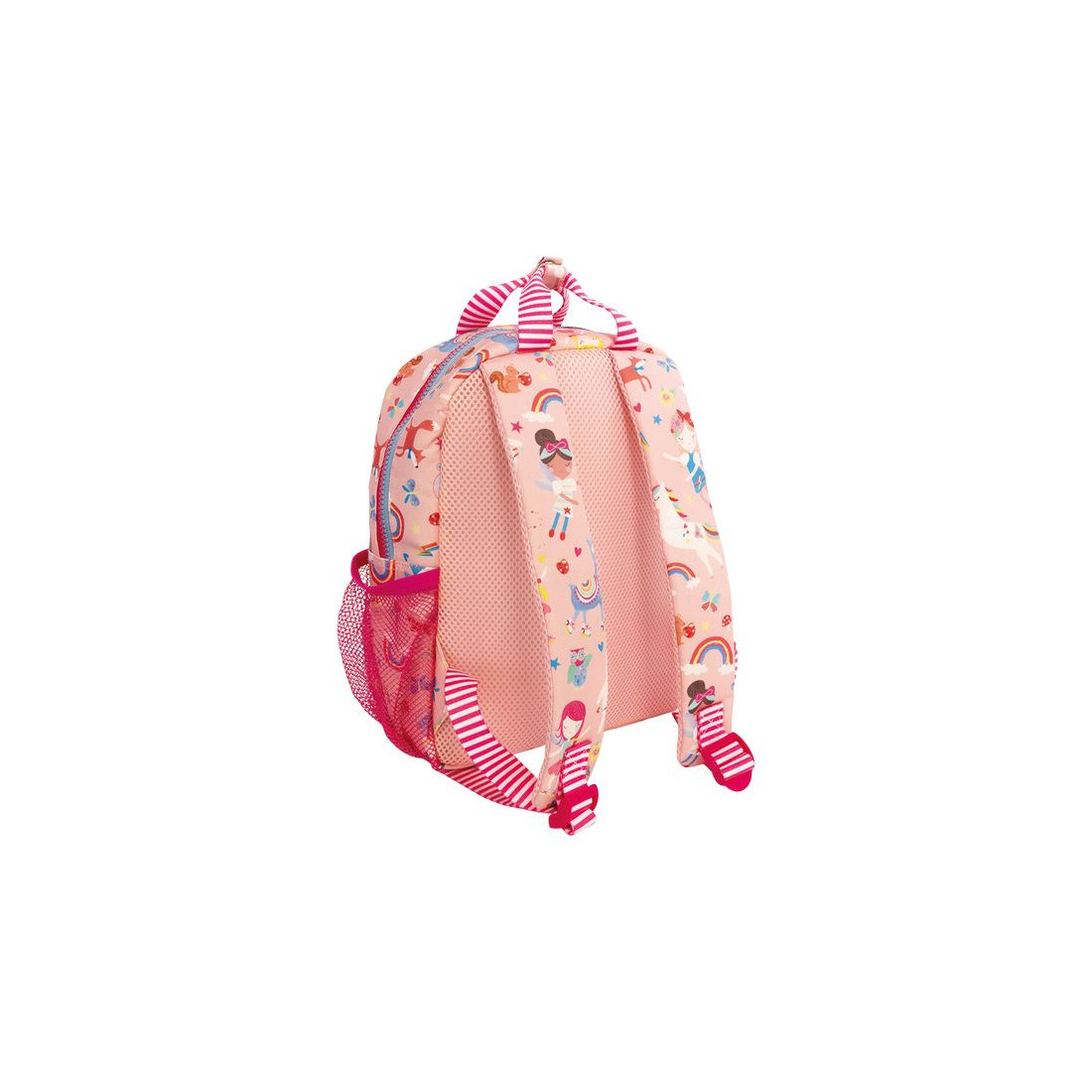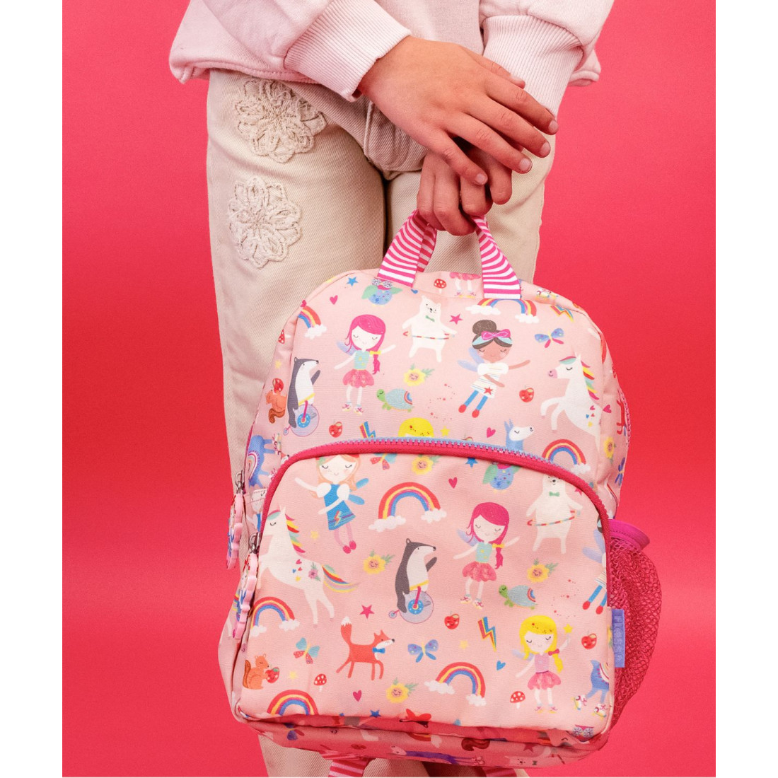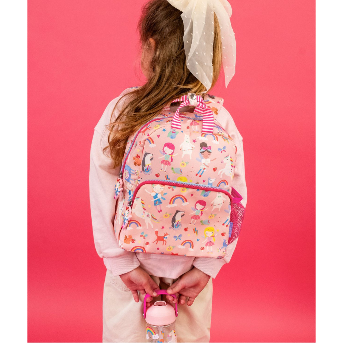 Plecak dla dzieci wykonany z materiałów z recyklingu, który łączy funkcjonalność i ekologiczną estetykę. Dzięki wodoodpornemu materiałowi – książki, przybory i lunch – pozostaną suche nawet w deszczowe dni. Intensywne kolory, motyw wróżek oraz detale jak kolorowe zamki i breloki czynią go idealnym towarzyszem do przedszkola, na wycieczki i codzienne przygody.
