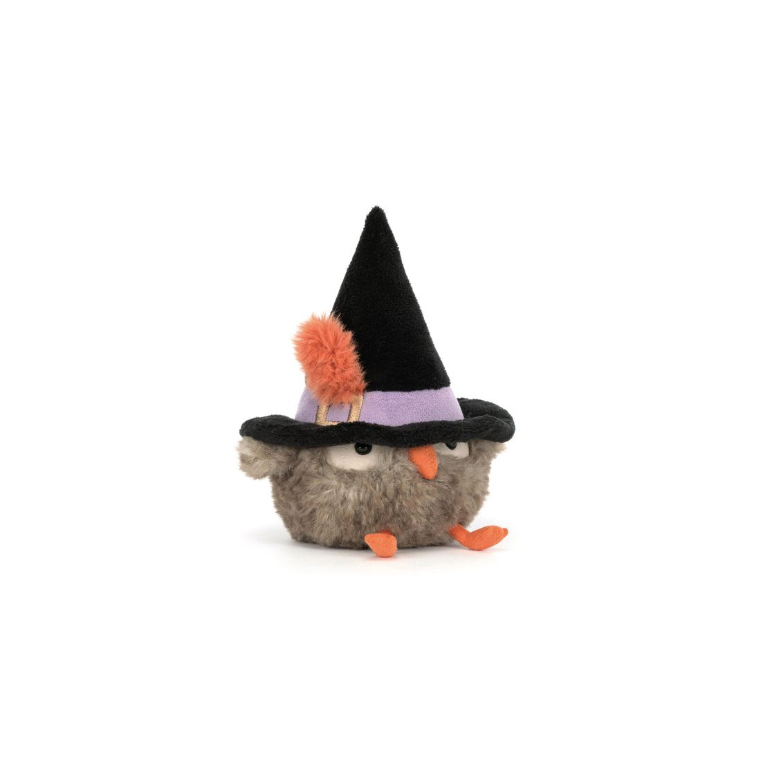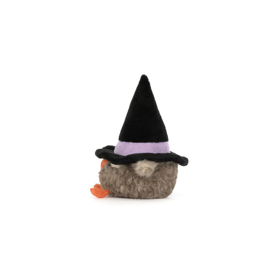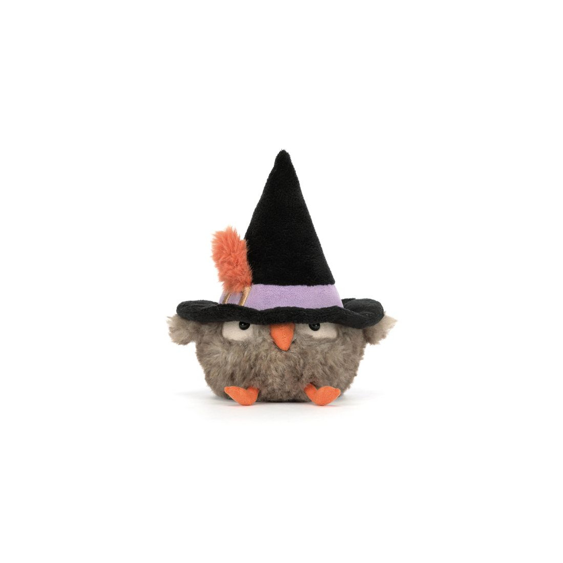 Sowa Czarodziejka w kapeluszu marki Jellycat London ma miękki, pomarańczowy dzióbek i łapki, urocze kępkowate uszka i okrągły brzuszek. Na głowie nosi szpiczasty czarodziejski kapelusz z piórkiem, gotowa na noc pełną magicznych przygód. Jest mięciutka, urocza i pełna wdzięku – idealna do przytulania podczas jesiennych wieczorów i zabaw w halloweenowym klimacie.