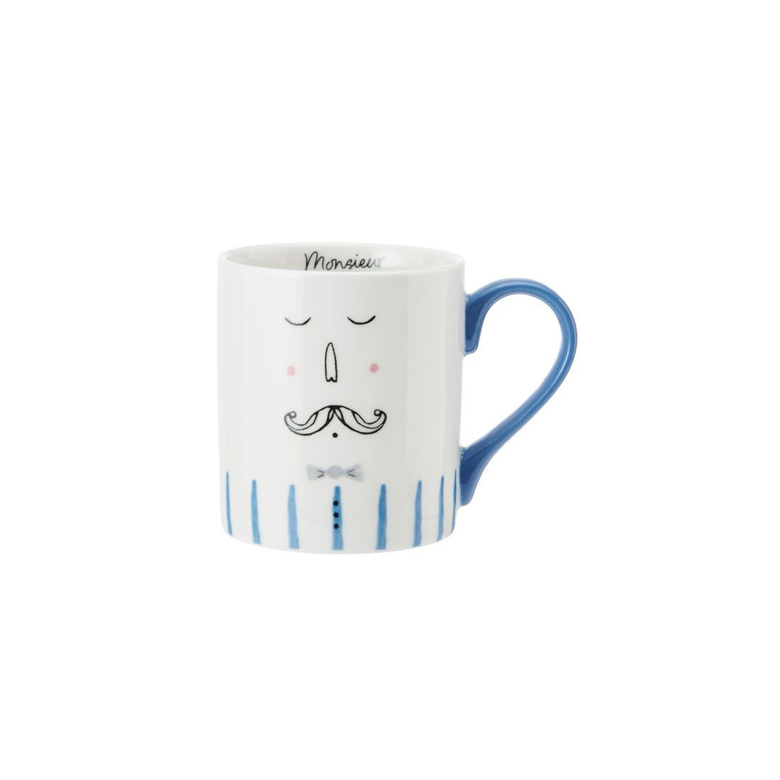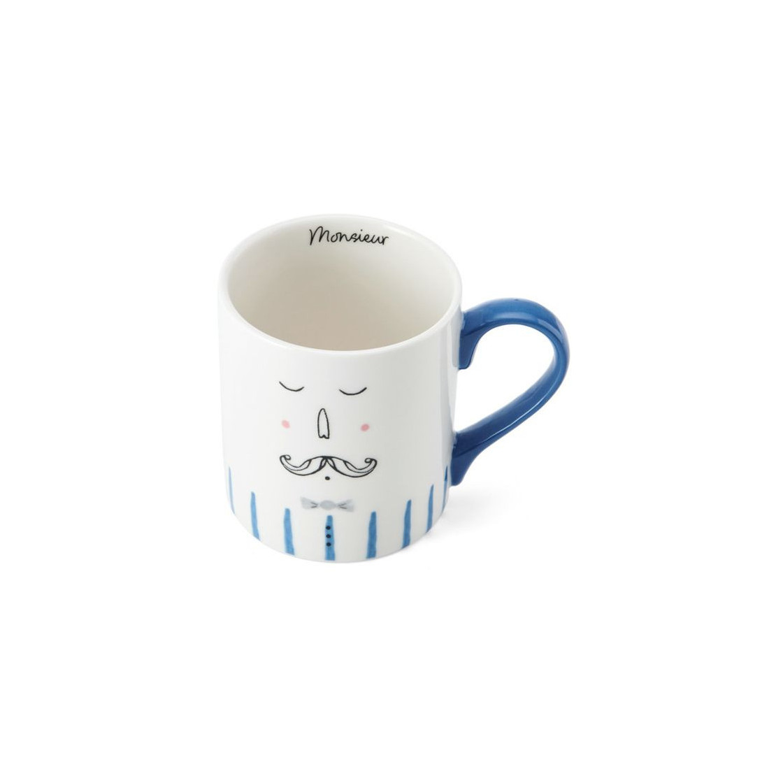 Kubek z akwarelową ilustracją przedstawiającą przedstawia wesołą twarz dżentelmena z wąsami i muszką, ubranego w niebieską koszulę w paski. Wewnątrz kubka widnieje napis „Monsieur”. Ze względu na charakter wzoru zalecamy mycie ręczne. Ten nowatorski kubek nie tylko sprawi przyjemność Tobie, ale także będzie przemyślanym i znaczącym prezentem dla Twoich znajomych. Kubek zapakowany jest w pudełko upominkowe.
