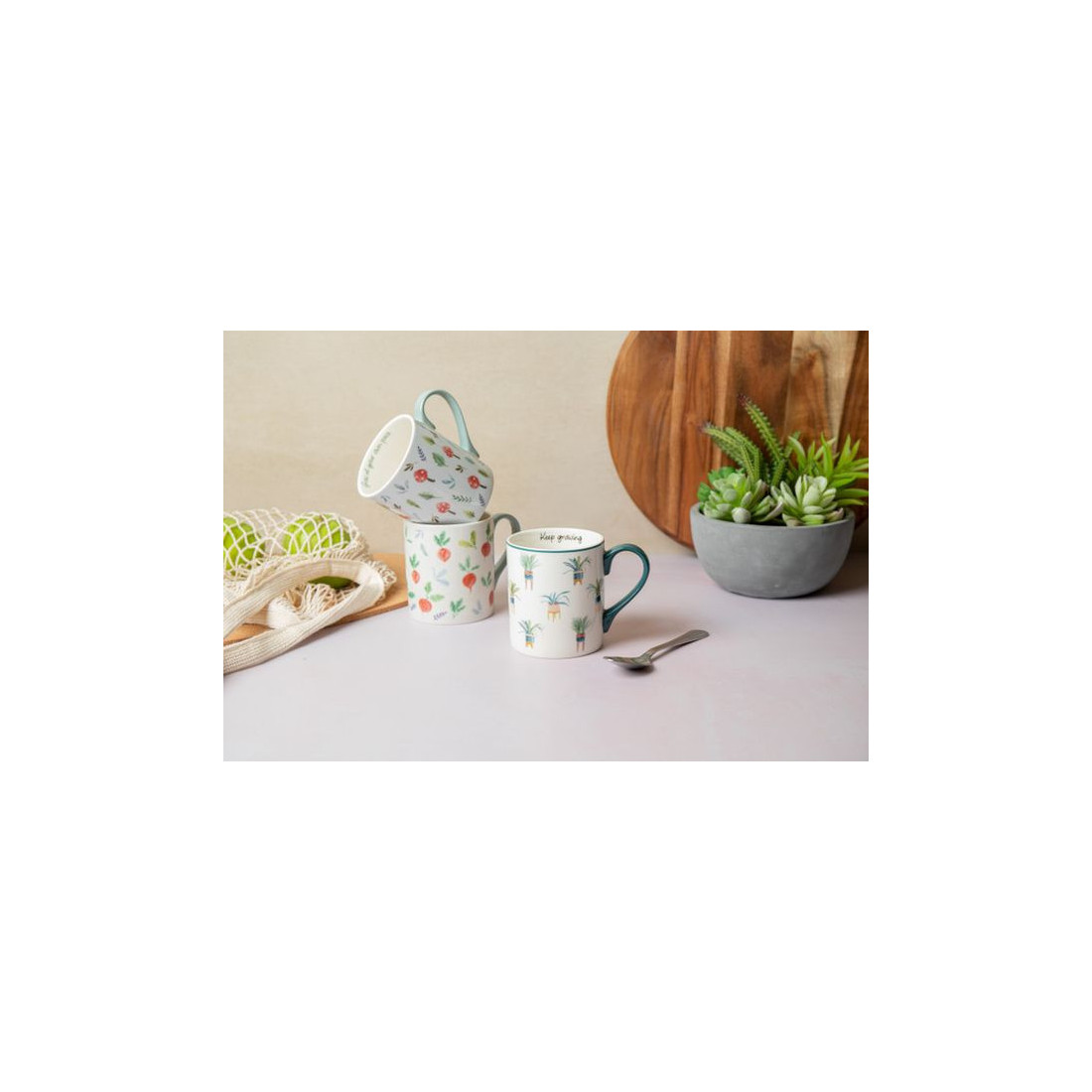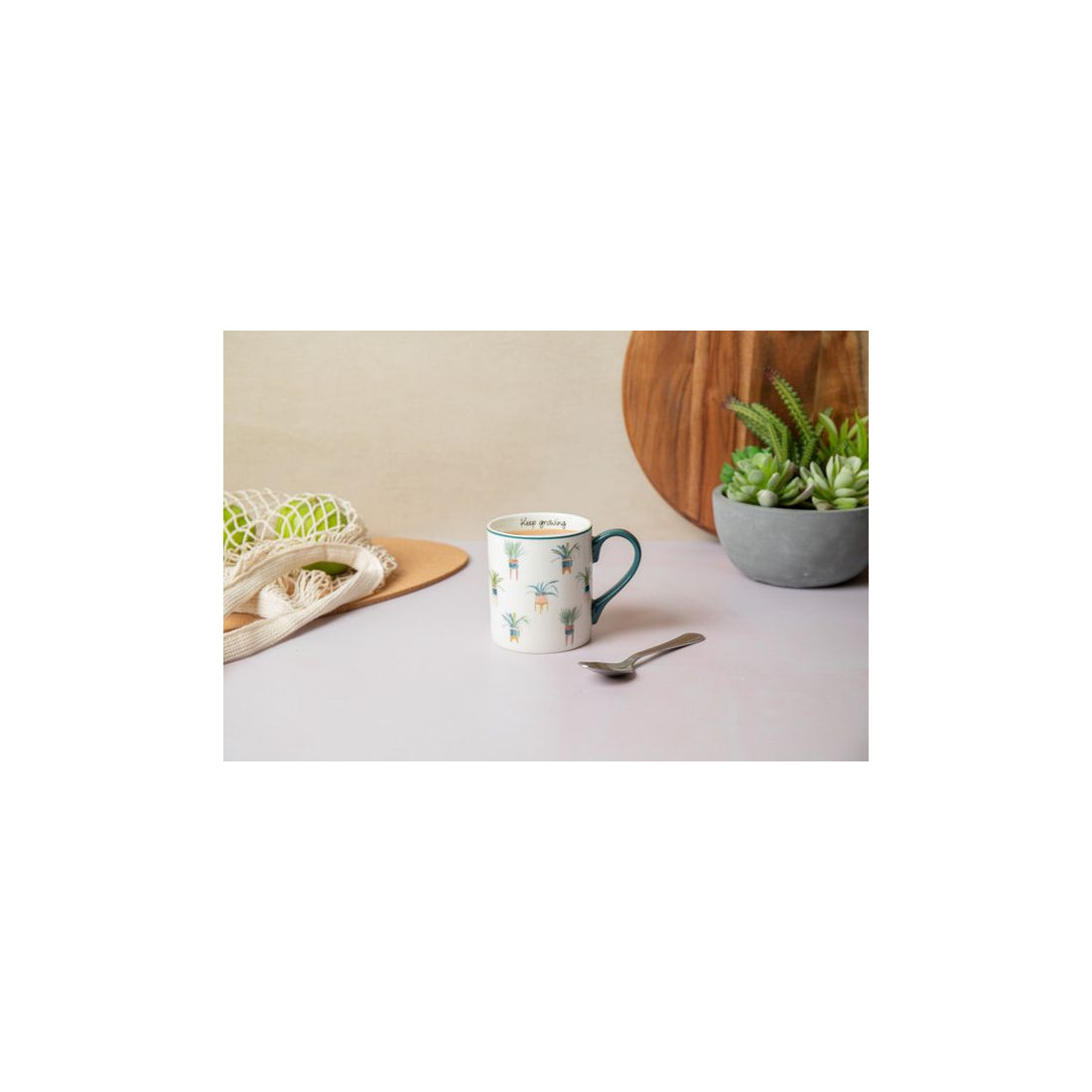 Elegancki kubek porcelanowy Mikasa Plant to piękny element, który upiększy przyjemność picia kawy lub herbaty. Ten elegancki kubek porcelanowy posiada zielone akcenty na krawędzi i uchwycie, a wewnątrz znajduje się motywacyjne przesłaniem „Rozwijaj się”, aby zainspirować Cię do dalszego sięgania po swoje cele. Wykonany z wytrzymałej porcelany. Ze względu na charakter wzoru zalecamy mycie ręczne. Każdy kubek jest ładnie zapakowany w pudełko upominkowe, co czyni go idealnym, przemyślanym prezentem dla miłośników roślin. Kubek zapakowany jest w pudełko upominkowe.