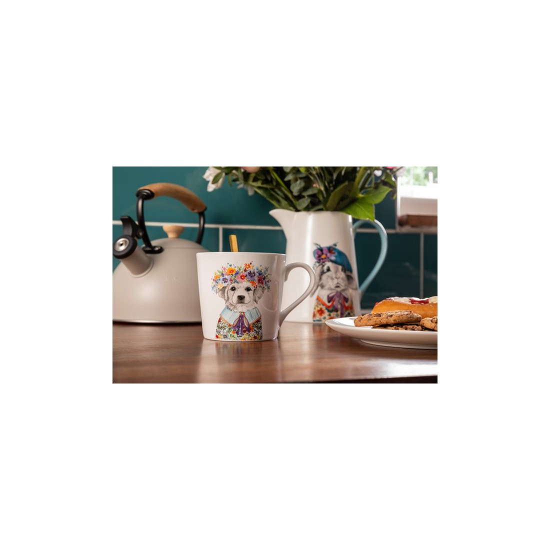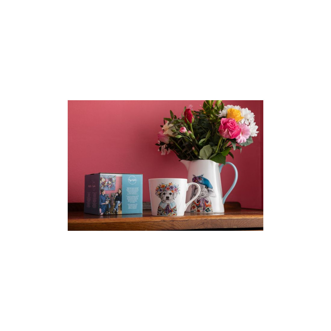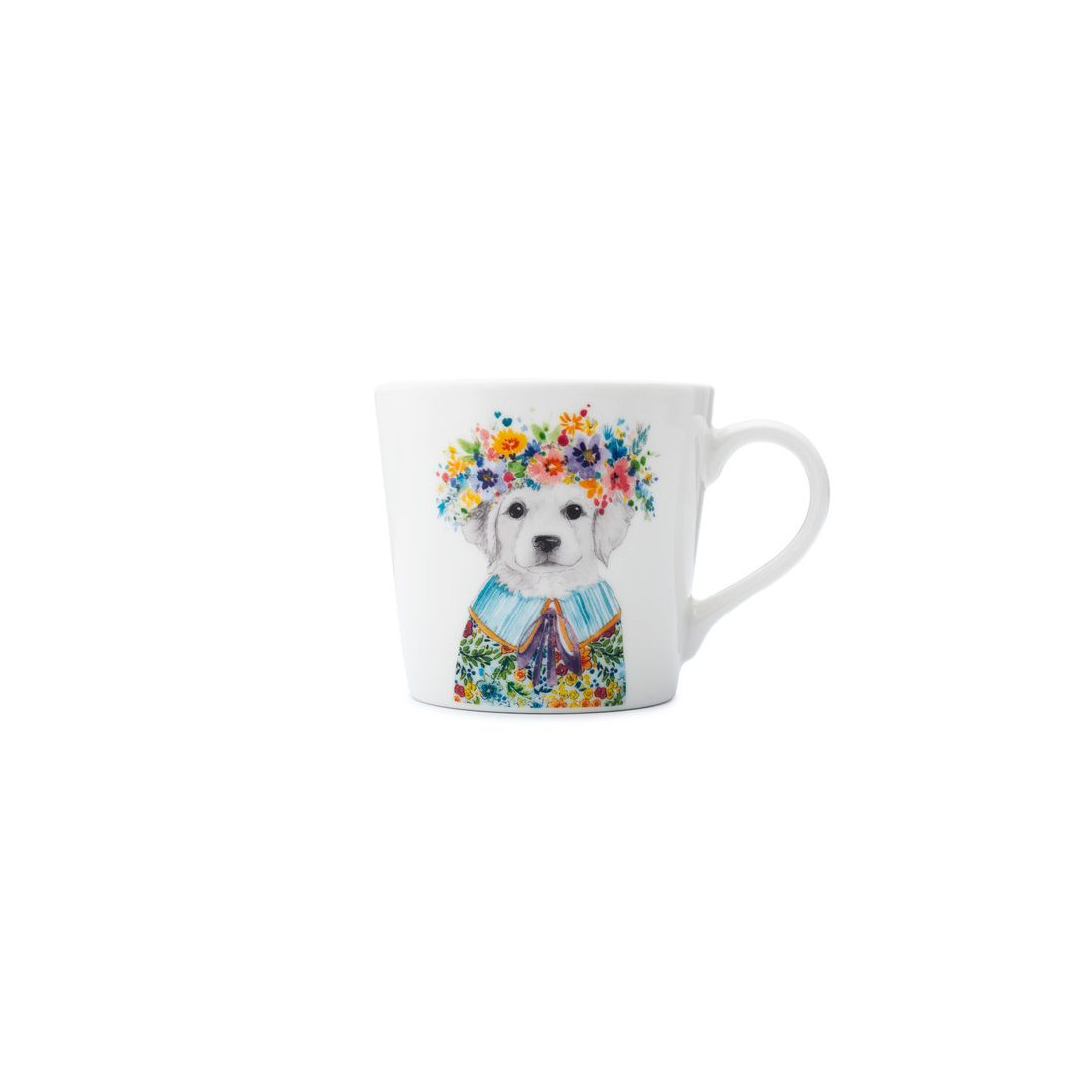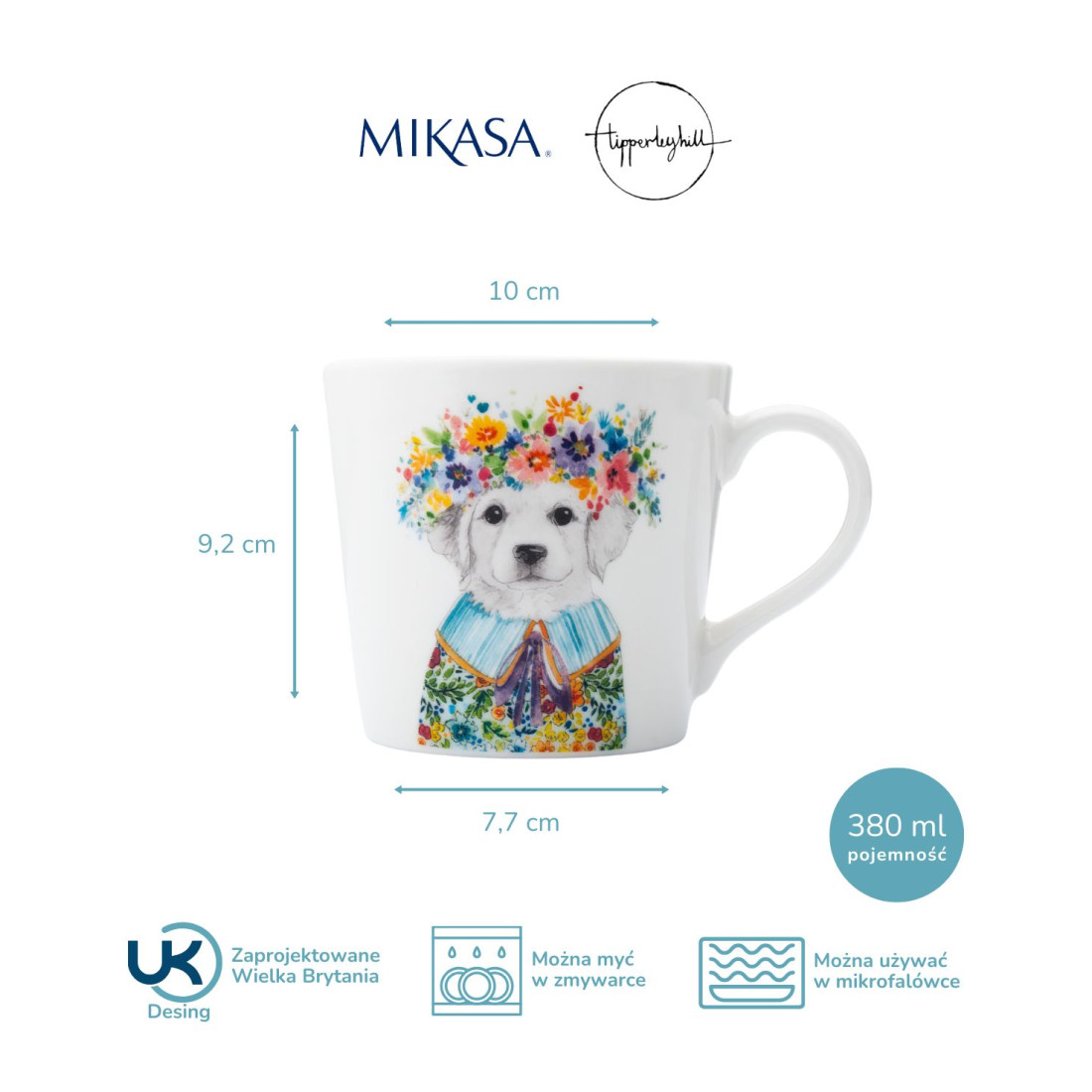 Porcelanowy kubek z kolekcji Mikasa, ozdobiony zabawną, efektowną grafiką przedstawiającą uroczego szczeniaka z kwiecistym wiankiem. Wykonany z wysokiej jakości porcelany, jest zarówno trwały, jak i stylowy – idealny do codziennego delektowania się ulubionymi gorącymi napojami. Ten kubek nie tylko przyniesie radość, ale także będzie doskonałym prezentem dla każdego entuzjasty natury. Kubek jest zapakowany w eleganckie pudełko upominkowe.