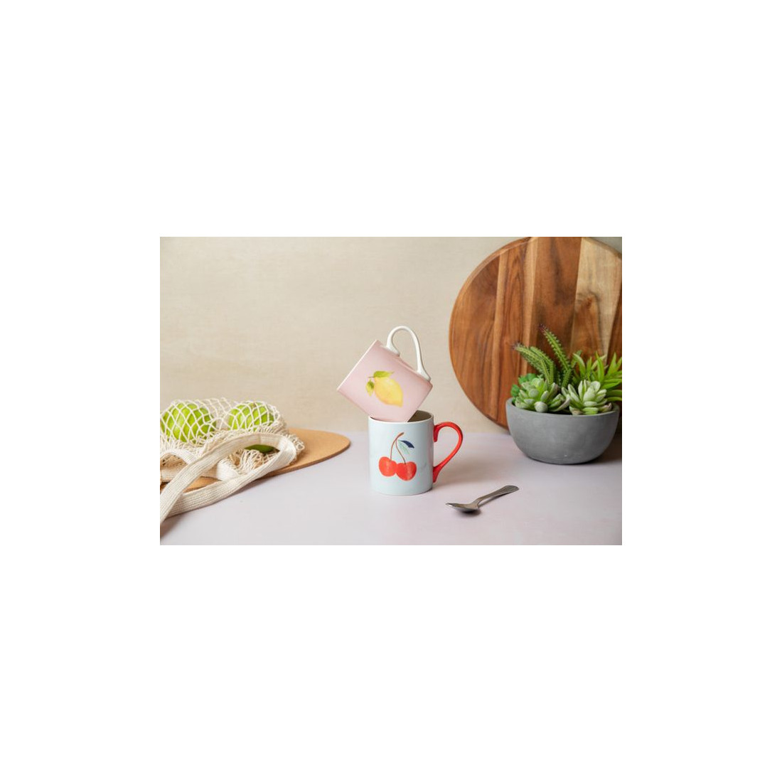 Kubek porcelanowy marki Mikasa to atrakcyjny dodatek do kuchni lub przemyślany prezent dla kogoś wyjątkowego. Ten nowatorski kubek przedstawia piękną akwarelową ilustrację jasnoczerwonej wiśni na pastelowym niebieskim tle, tworząc piękny kontrast. Zielony uchwyt uzupełnia projekt, a wiadomość wewnątrz kubka, "Mon cheri", dodaje zabawnego akcentu do codziennej rutyny. Wykonany z wytrzymałej porcelany kubek z nadrukiem ma pojemność 280 ml.