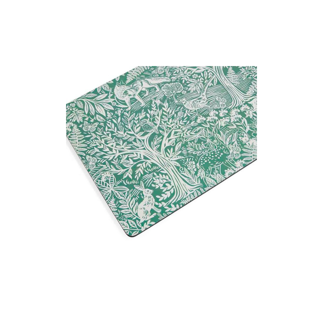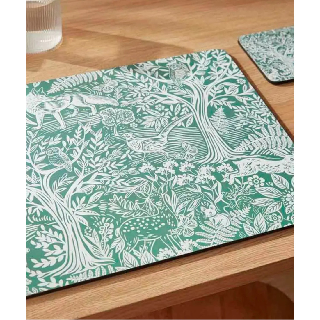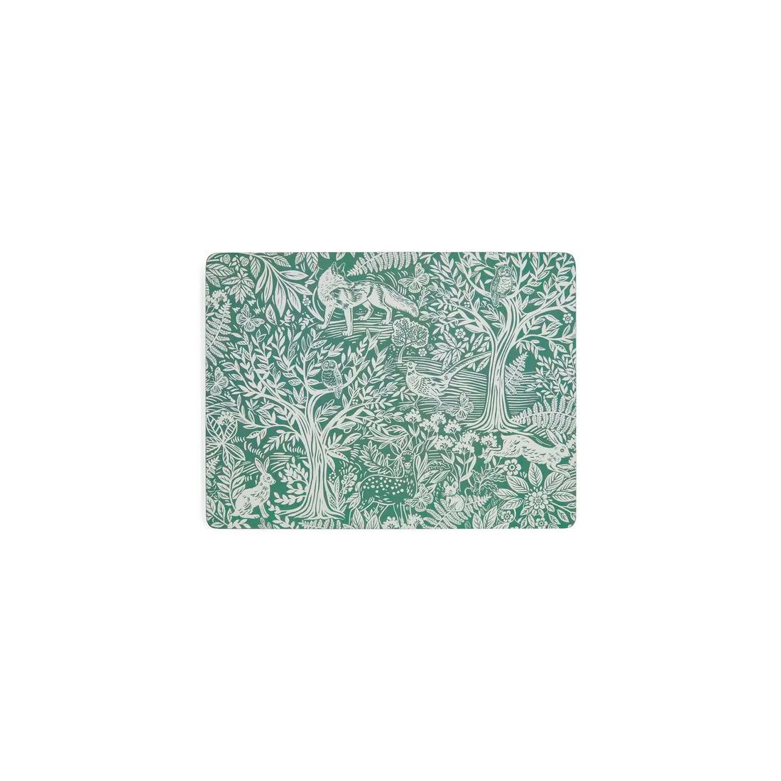 Zestaw czterech eleganckich i praktycznych podkładek korkowych marki Pimpernel, ozdobionych uroczym, szałwiowozielonym wzorem przedstawiającym leśne stworzenia i piękne motywy botaniczne. Łączą styl z funkcjonalnością, a dzięki ponadczasowym wzorom i wysokiej jakości wykonaniu stanowią elegancką ozdobę stołu oraz świetny pomysł na prezent.