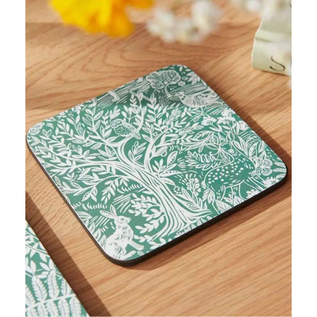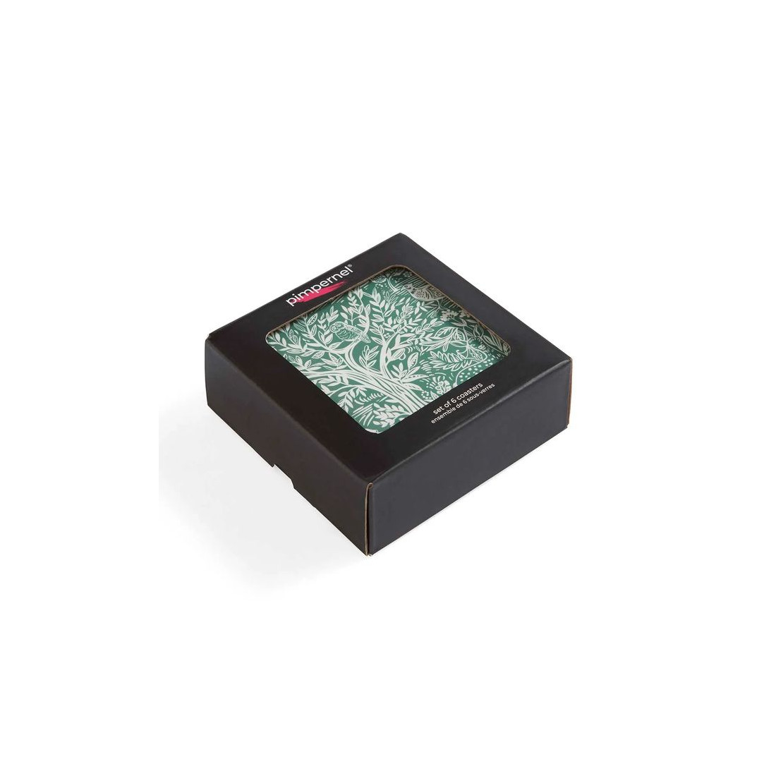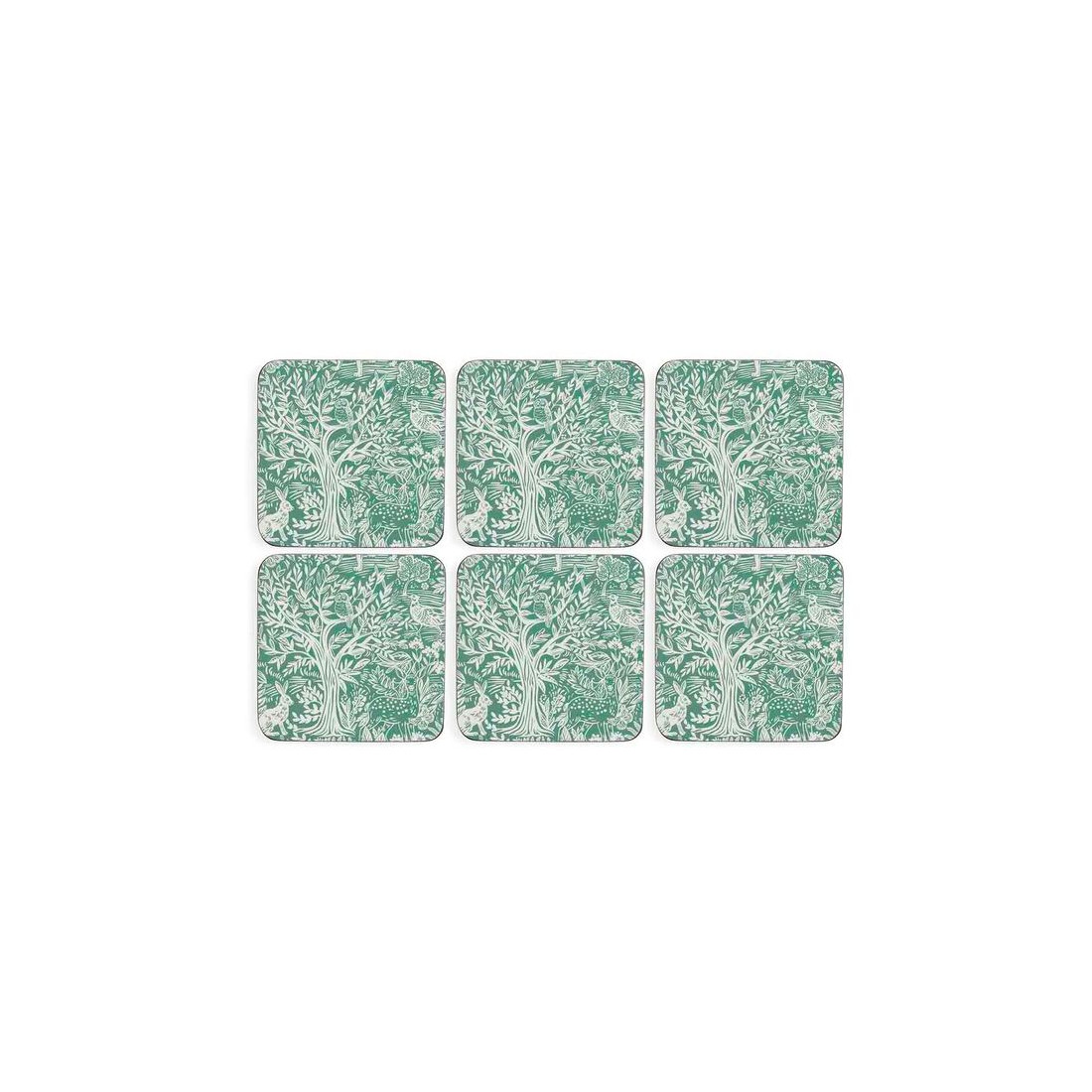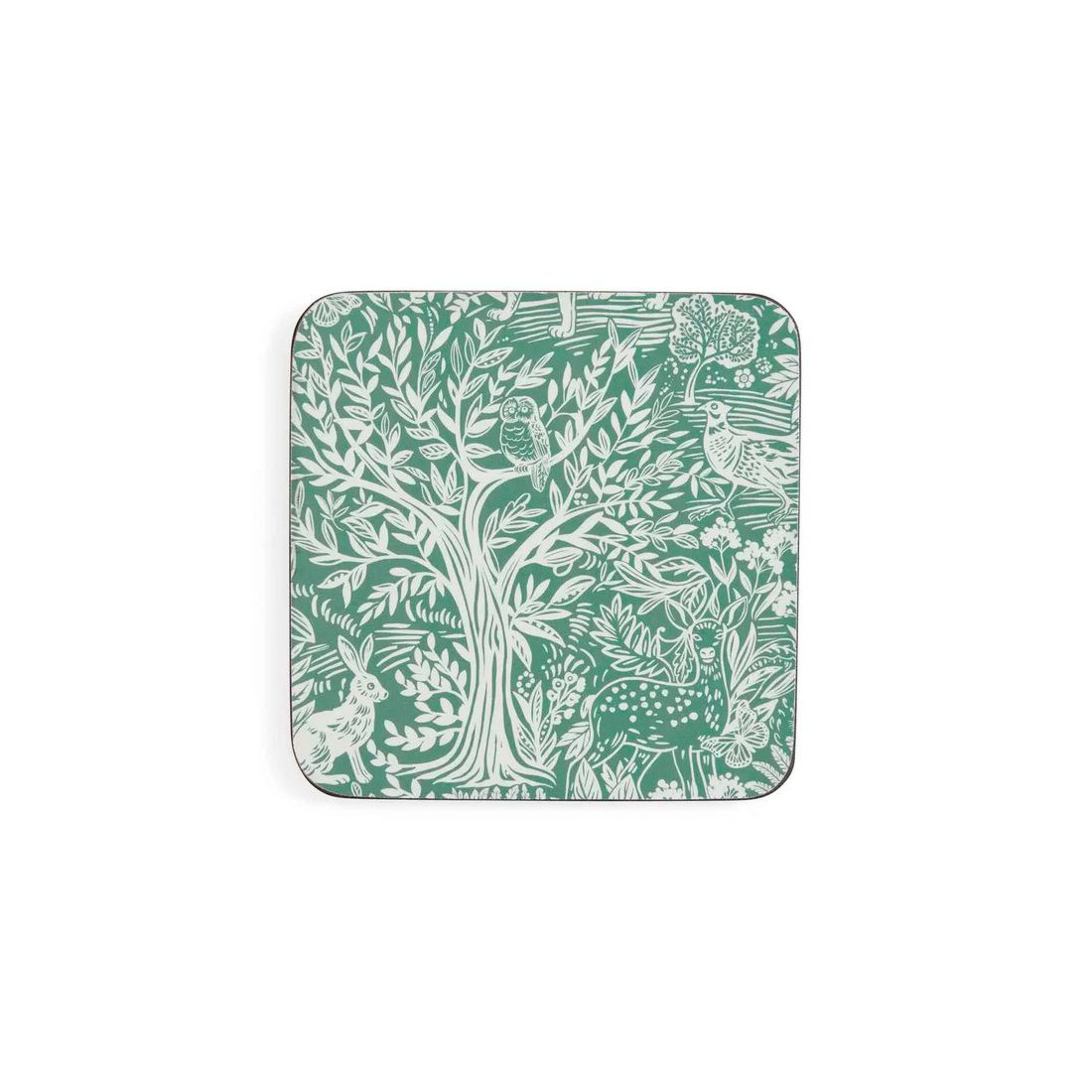 Zestaw sześciu eleganckich i praktycznych podkładek korkowych marki Pimpernel, ozdobionych uroczym, szałwiowozielonym wzorem przedstawiającym leśne stworzenia i piękne motywy botaniczne. Łączą styl z funkcjonalnością, a dzięki ponadczasowym wzorom i wysokiej jakości wykonaniu stanowią elegancką ozdobę stołu oraz świetny pomysł na prezent.