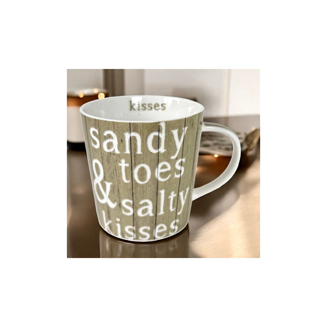 Kubek porcelanowy o pojemności 350 ml, zdobiony motywem drewnianych desek z pokładu statku i gwiazd oraz stylizowanym napisem: „Sandy toes & salty kisses”. Wykonany z porcelany charakteryzującej się wyjątkową elegancją i wytrzymałością. Poręczne ucho gwarantuje stabilny uchwyt podczas picia. Zapakowany w ozdobne pudełko, o tym samym motywie. To doskonały pomysł na upominek dla najbliższych, przyjaciół i znajomych.