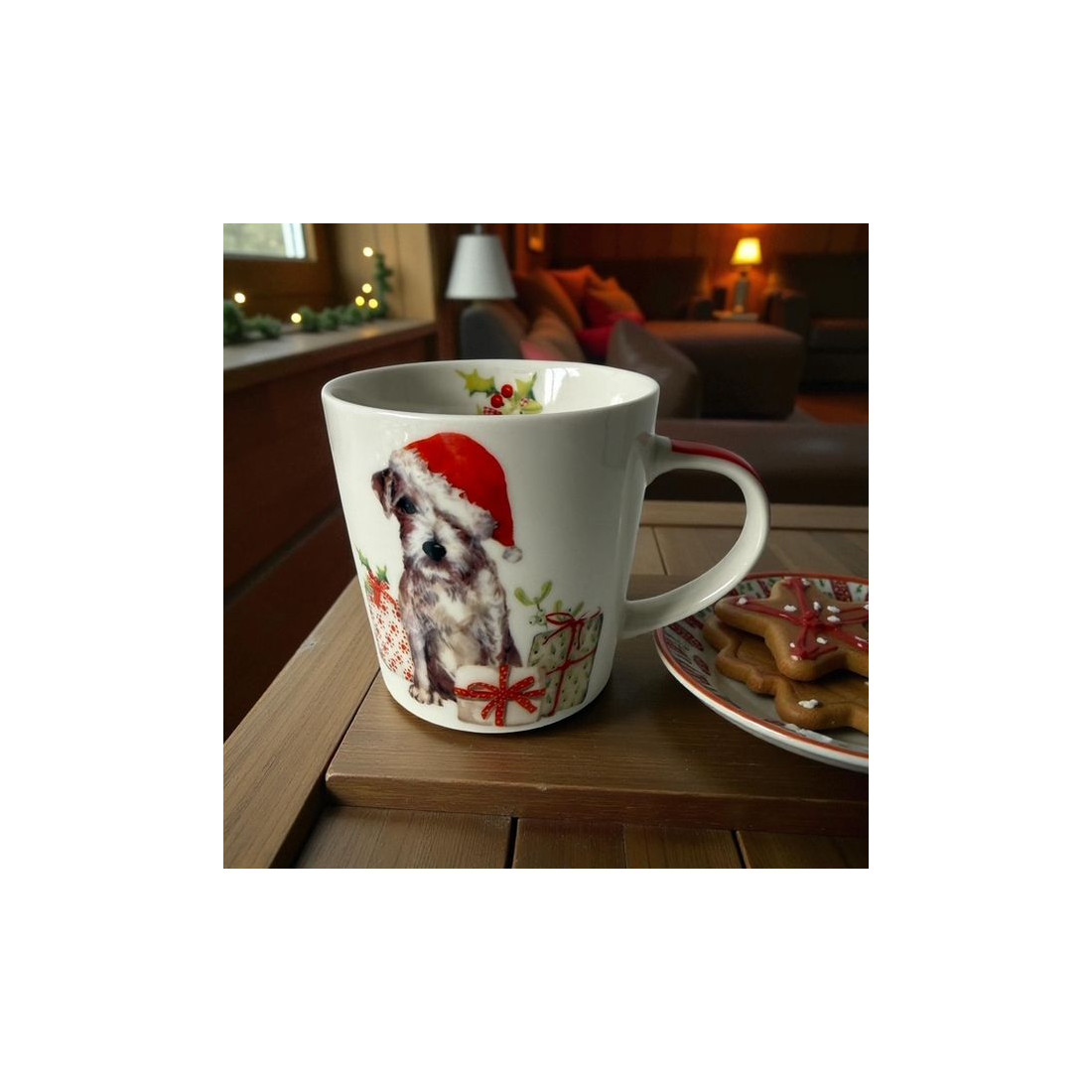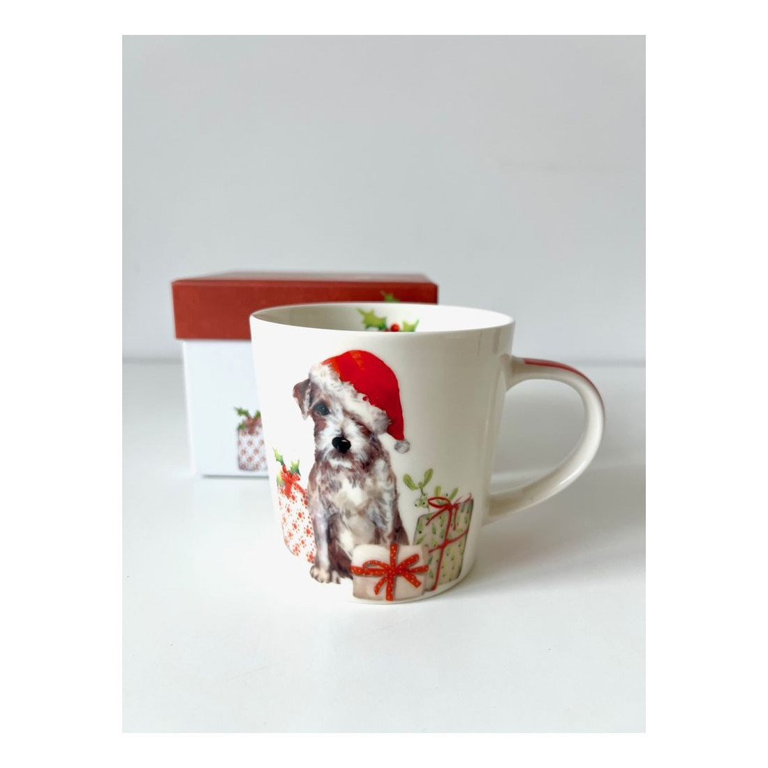 Kubek porcelanowych o pojemności 350 ml z motywem pieska w czerwonej czapce i prezentami. Wykonany z porcelany charakteryzującej się wyjątkową elegancją i wytrzymałością. Poręczne ucho gwarantuje stabilny uchwyt podczas picia. Zapakowany w ozdobne pudełko, o tym samym motywie. To doskonały pomysł na upominek dla najbliższych, przyjaciół i znajomych.