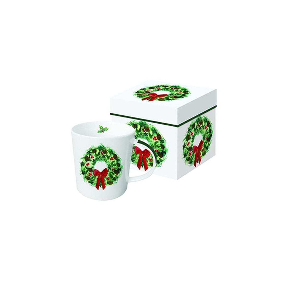 Kubek porcelanowych o pojemności 350 ml z motywem świątecznego wieńca. Wykonany z porcelany charakteryzującej się wyjątkową elegancją i wytrzymałością. Poręczne ucho gwarantuje stabilny uchwyt podczas picia. Zapakowany w ozdobne pudełko, o tym samym motywie. To doskonały pomysł na upominek dla najbliższych, przyjaciół i znajomych.