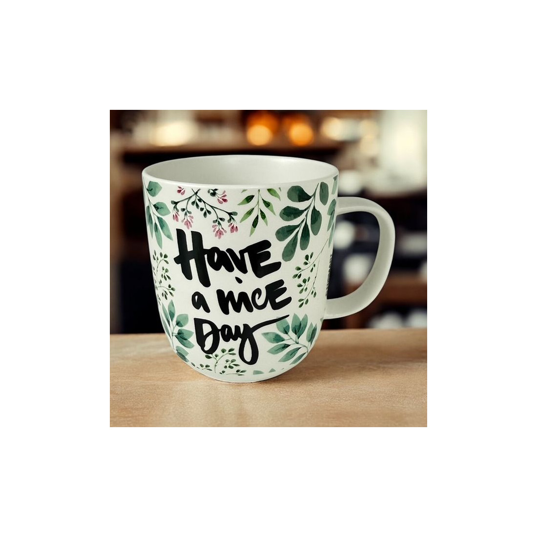 Kubek porcelanowy o pojemności 350 ml, przedstawiający stylizowany napis: „Have a nice day”. Wykonany z porcelany charakteryzującej się wyjątkową elegancją i wytrzymałością. Poręczne ucho gwarantuje stabilny uchwyt podczas picia. Zapakowany w ozdobne pudełko, o tym samym motywie. To doskonały pomysł na upominek dla najbliższych, przyjaciół i znajomych.
