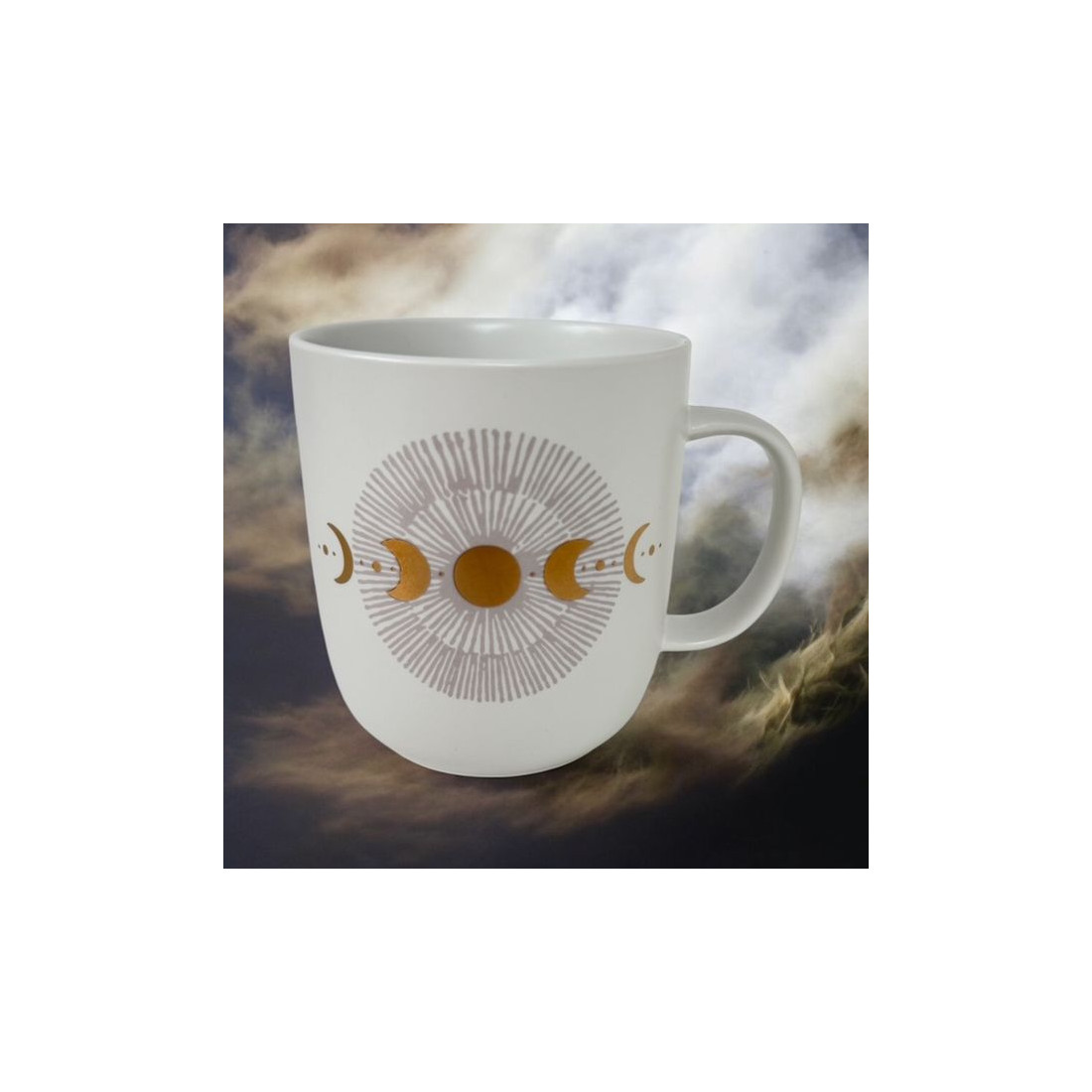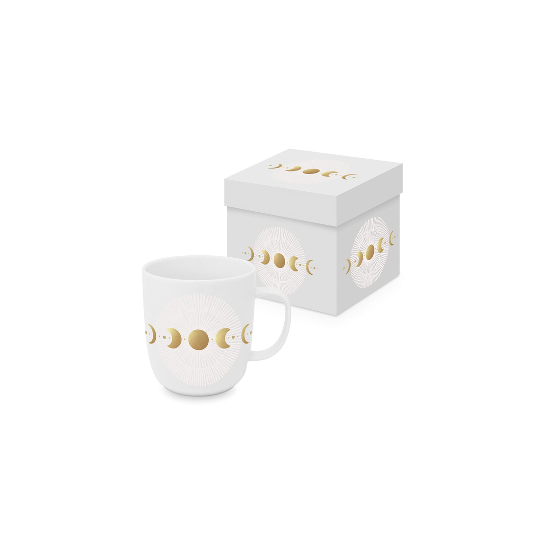 Kubek porcelanowy o pojemności 400 ml, zdobiony motywem faz księżyca w kolorze złotym na białym matowym tle. Wykonany z porcelany charakteryzującej się wyjątkową elegancją i wytrzymałością. Poręczne ucho gwarantuje stabilny uchwyt podczas picia. Zapakowany w ozdobne pudełko, o tym samym motywie. To doskonały pomysł na upominek dla najbliższych, przyjaciół i znajomych.
