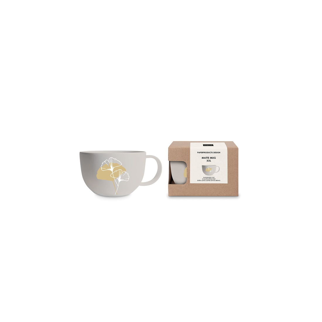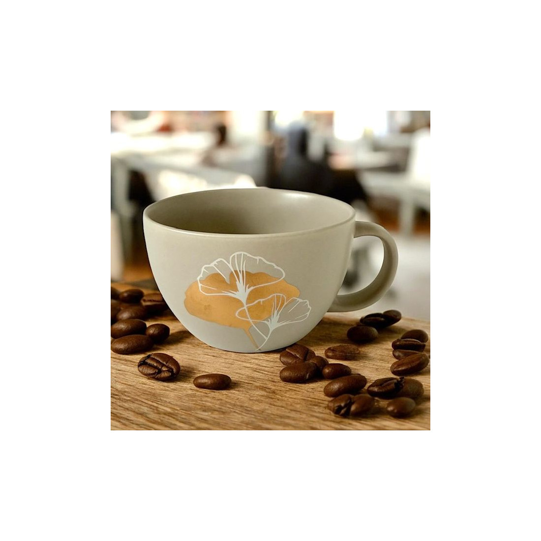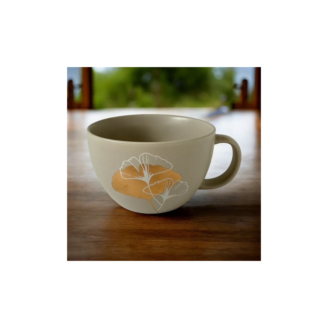 Kubek porcelanowy o pojemności 550 ml, zdobiony subtelnym złotym liściem na beżowym matowym tle. Wykonany z porcelany charakteryzującej się wyjątkową elegancją i wytrzymałością. Poręczne ucho gwarantuje stabilny uchwyt podczas picia.
