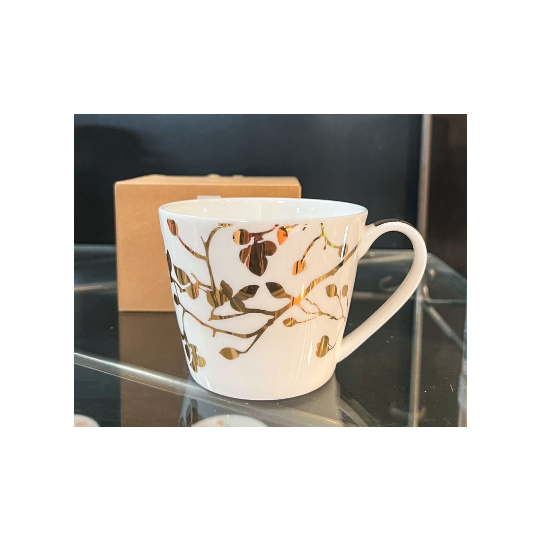 Kubek porcelanowy o pojemności 400 ml, zdobiony subtelnym motywem złotej gałązki. Wykonany z porcelany charakteryzującej się wyjątkową elegancją i wytrzymałością. Poręczne ucho gwarantuje stabilny uchwyt podczas picia. To doskonały pomysł na upominek dla najbliższych, przyjaciół i znajomych.