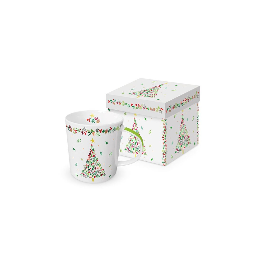 Kubek ozdobiony jest uroczym motywem kolorowego, świątecznego drzewka z brokatową gwiazdką i zapakowany w eleganckie upominkowe pudełko o tym samym wzorze.