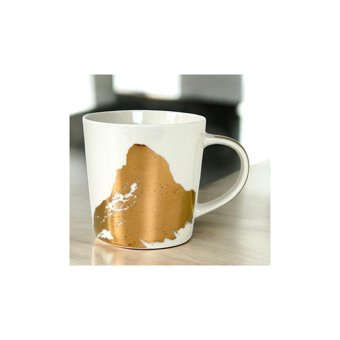 Kubek zdobi wspaniała, monumentalna góra w kolorze złota, tworząc wyjątkowy, luksusowy akcent na białym tle.