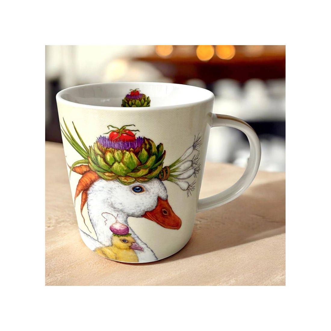 Kubek porcelanowy o pojemności 400 ml marki Paper Products Design przedstawiającym Łabędzie w pióropuszu z warzyw i roślin. Wykonany z porcelany magnezowej, która charakteryzuje się zarówno elegancją, jak i wytrzymałością. Poręczne ucho zapewnia komfort użytkowania. Zapakowany w ozdobne pudełko o tym samym motywie – to doskonały pomysł na upominek dla pasjonatów ogrodnictwa i miłośników przyrody.