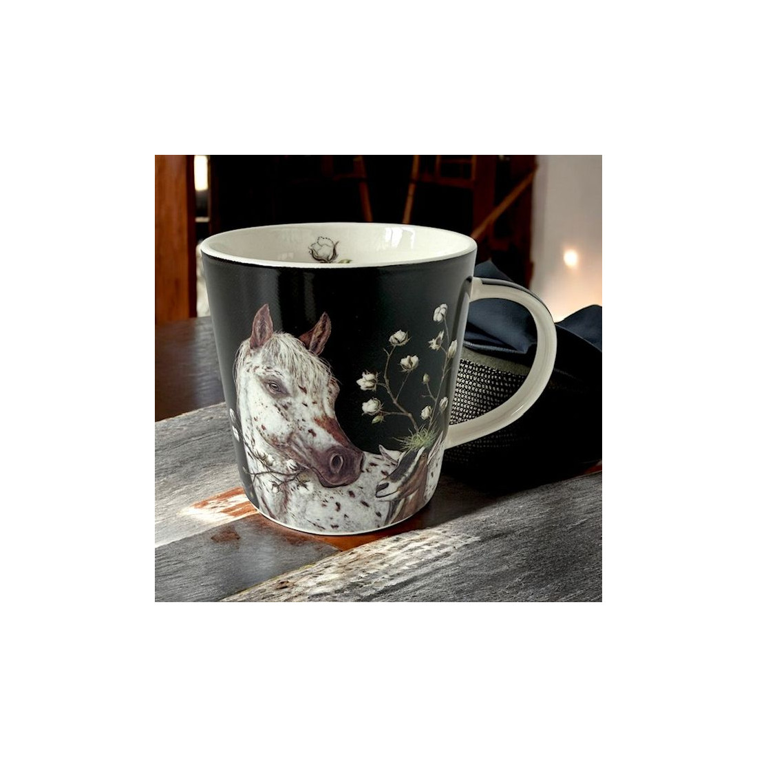 Kubek porcelanowy o pojemności 400 ml marki Paper Products Design z uroczym motywem konia i kózki, które wspólnie spędzają czas w harmonii. Wykonany z porcelany magnezowej, która jest zarówno elegancka, jak i wytrzymała. Poręczne ucho zapewnia komfort picia. Zapakowany w ozdobne pudełko o tym samym motywie – to doskonały pomysł na upominek dla miłośników zwierząt i natury.