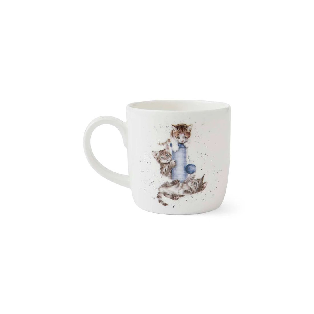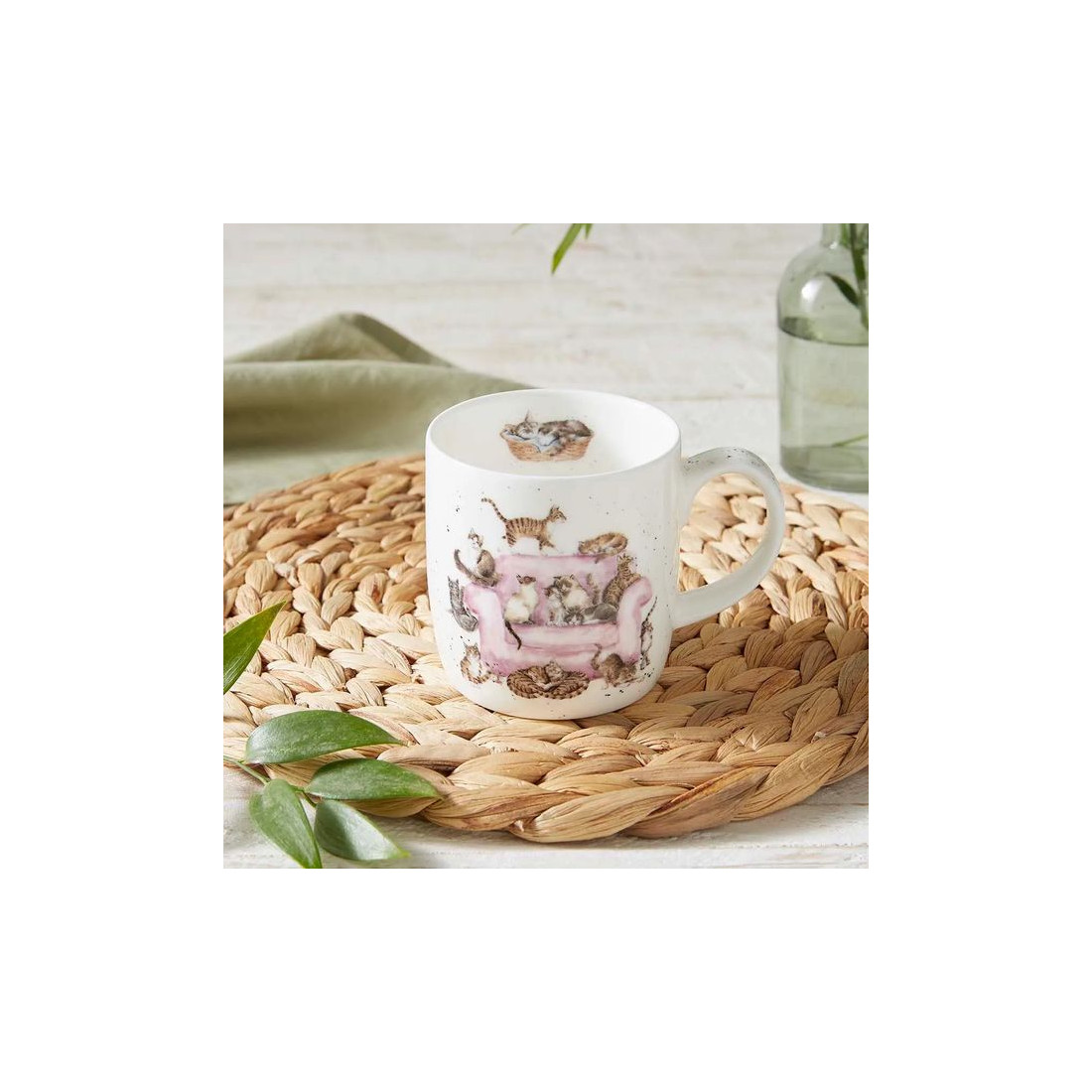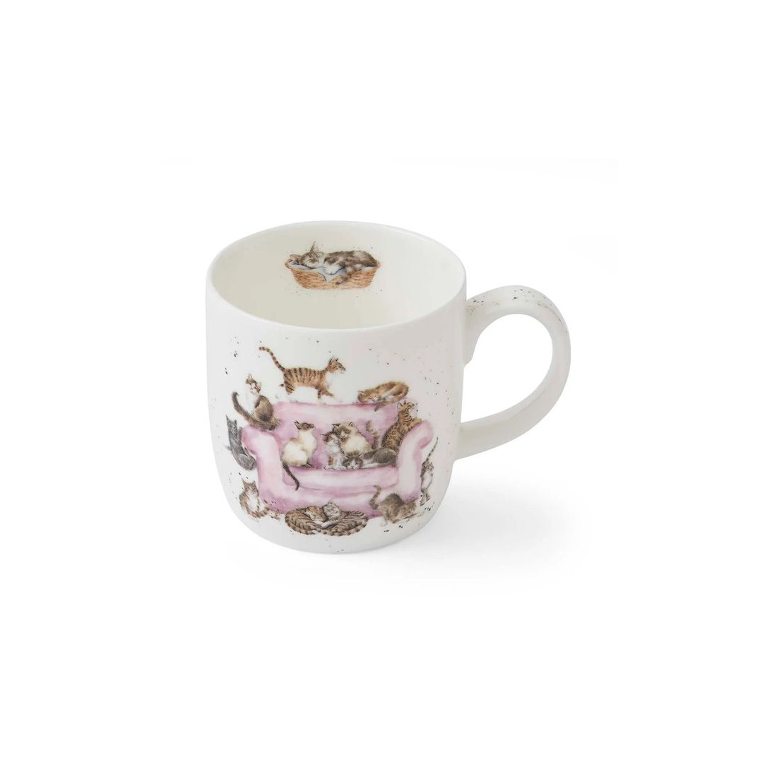 Kubek z kolekcji Wrendale Designs marki Royal Worcester to idealny wybór dla każdego miłośnika kotów. Kubek z porcelany kostnej przedstawia urokliwą ilustrację różowego fotela, na którym w różnych pozach odpoczywają urocze koty. Z kolei na odwrocie kubka trzy figlarne kociaki bawią się przy słupku do drapania. Kubek ten doskonale oddaje unikalną osobowość i niezaprzeczalny urok naszych futrzanych przyjaciół, co sprawia, że jest to idealny prezent dla każdego miłośnika kotów.