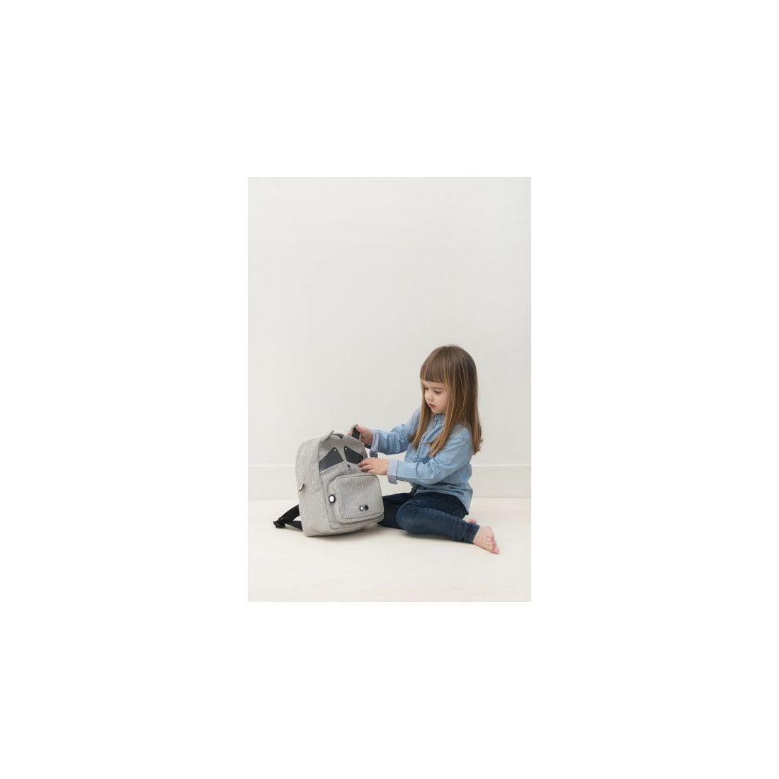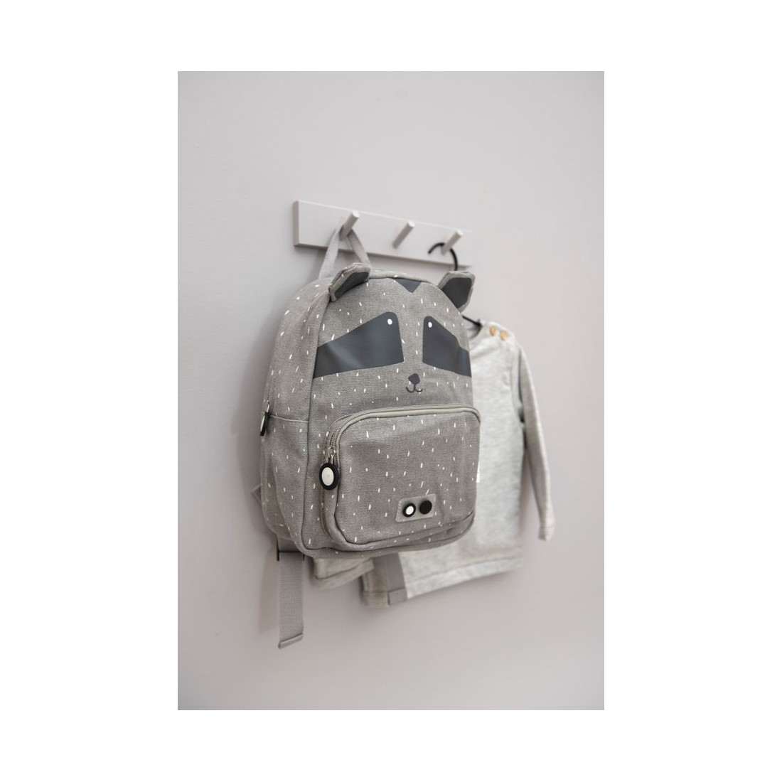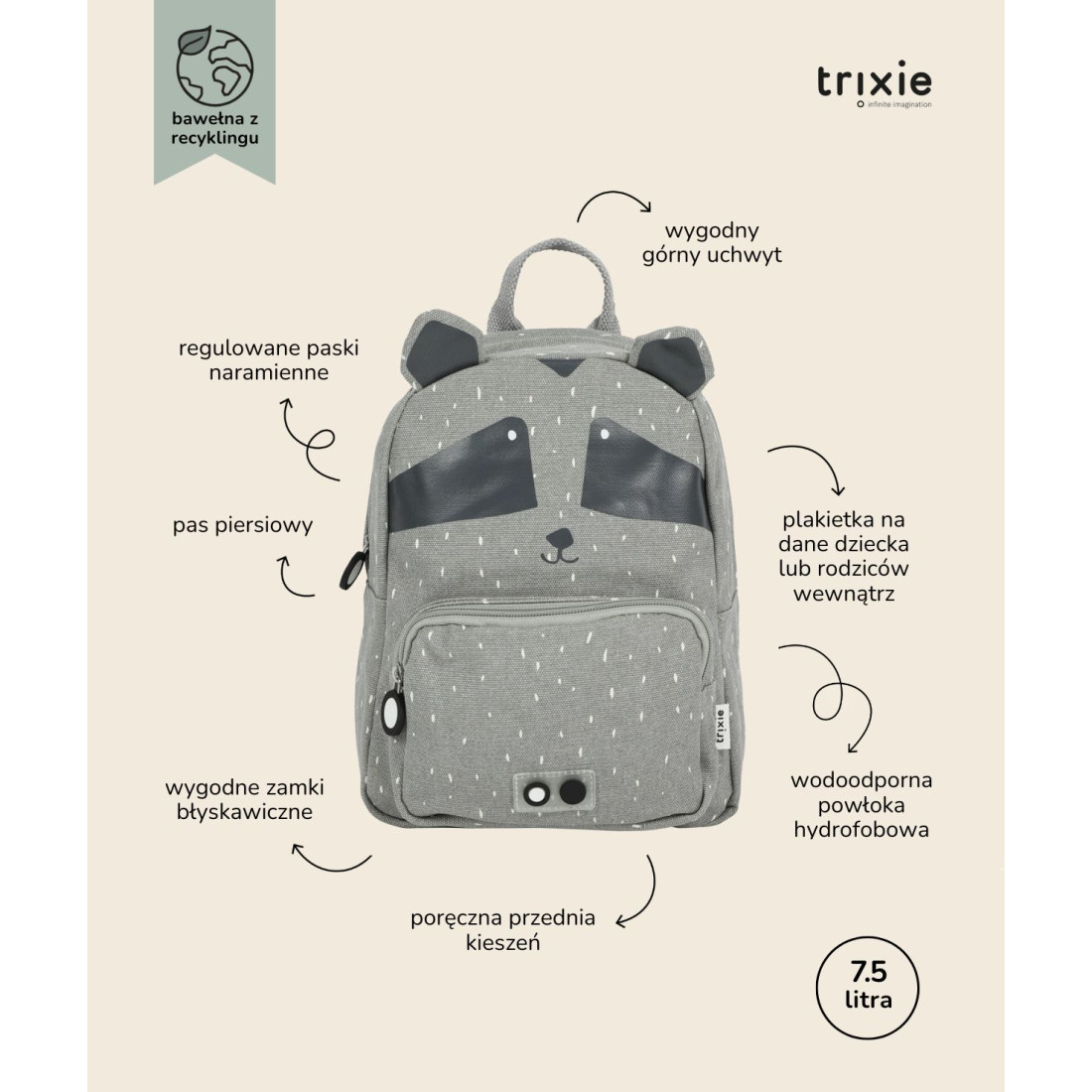 Plecak Trixie Baby posiada regulowane i wyściełane paski naramienne oraz stabilizujący pasek na klatkę piersiową, który nie tylko zapobiega opadaniu pasków naramiennych, ale także równomiernie rozkłada ciężar, redukując obciążenie pleców dziecka. Wyposażony jest także w uchwyt górny ułatwiający trzymanie, przenoszenie oraz zawieszanie w dowolnym miejscu, na przykład w szatni. Plecak posiada dużą komorę i małą przednią kieszeń, w której można wygodnie przechowywać przekąski lub inne cenne drobiazgi. Komora główna i przednia kieszeń zamykane są na zamki błyskawiczne, co umożliwia dziecku łatwe otwieranie i zamykanie plecaka. Wewnątrz znajduje się plakietka z danymi kontaktowymi ułatwiająca identyfikację i zwrot w przypadku zgubienia. Plecak wykonany jest z wysokiej jakości bawełny i pokryty powłoką akrylową, która chroni zawartość przed wilgocią i deszczem. Można go prać w pralce z delikatnym płukaniem, ale należy pamiętać, że im częściej będzie prany, tym mniej będzie wodoodporny.