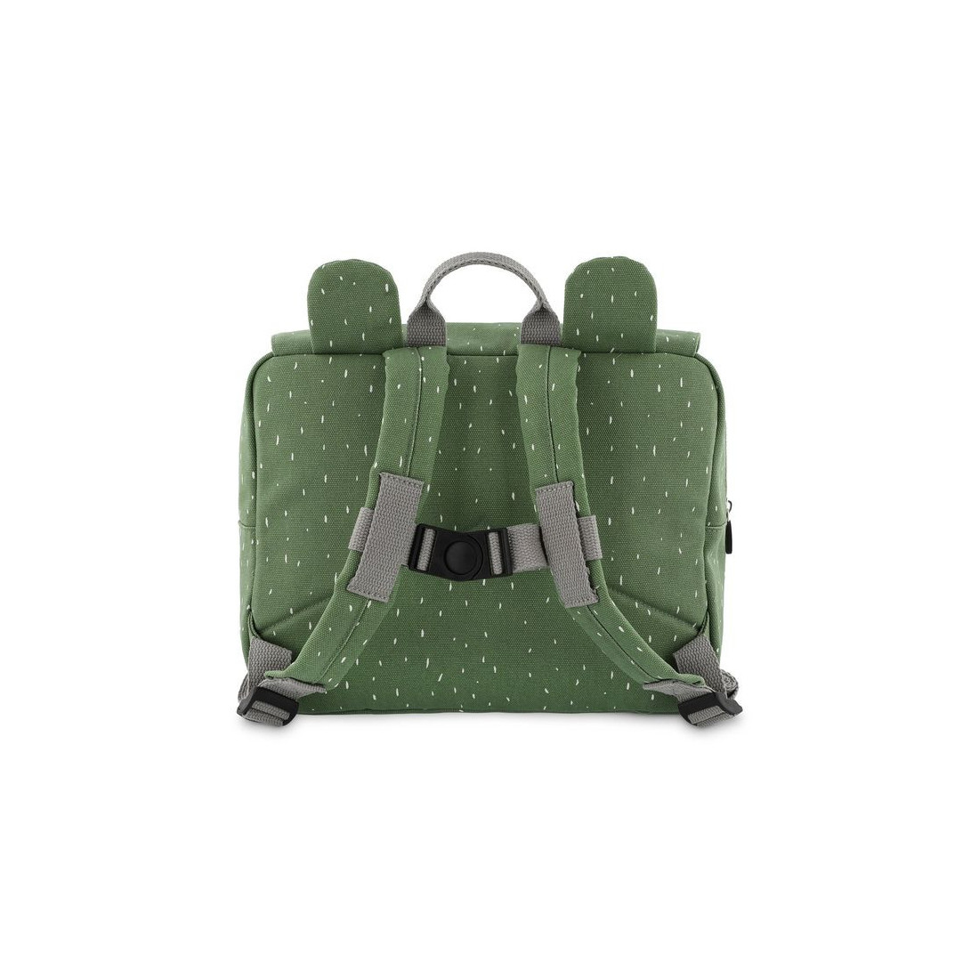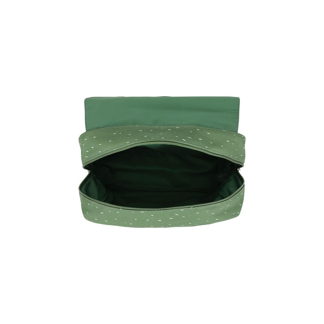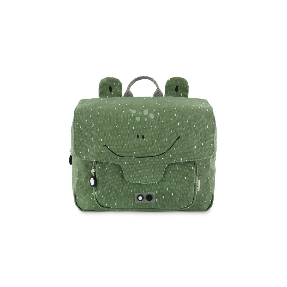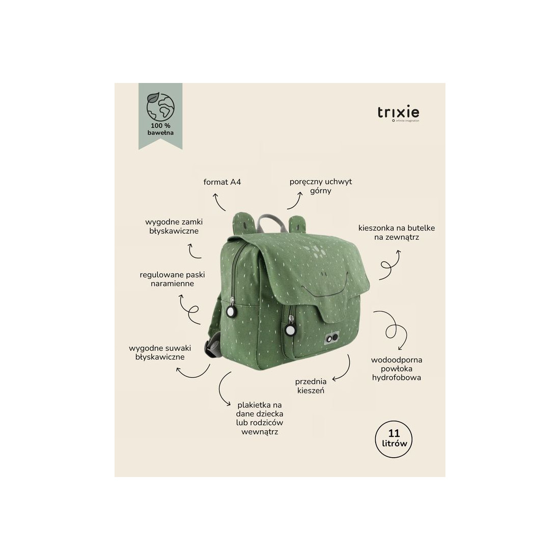 Tornister Trixie Baby posiada regulowane i wyściełane paski naramienne oraz stabilizujący pasek na klatkę piersiową, który nie tylko zapobiega opadaniu pasków naramiennych, ale także równomiernie rozkłada ciężar, redukując obciążenie pleców dziecka. Wyposażony jest także w uchwyt górny ułatwiający trzymanie, przenoszenie oraz zawieszanie w dowolnym miejscu, na przykład w szatni. Tornister posiada dużą komorę w której zmieszczą się zeszyty formatu A4 i małą przednią kieszeń, w której można wygodnie przechowywać przekąski lub inne cenne drobiazgi. Komora główna i przednia kieszeń zamykane są na zamki błyskawiczne, co umożliwia dziecku łatwe otwieranie i zamykanie plecaka. Wewnątrz znajduje się plakietka z danymi kontaktowymi ułatwiająca identyfikację i zwrot w przypadku zgubienia. Tornister wykonany jest z bawełny z recyklingu i pokryty powłoką akrylową, która chroni zawartość przed wilgocią i deszczem. Można go prać w pralce z delikatnym płukaniem, ale należy pamiętać, że im częściej będzie prany, tym mniej będzie wodoodporny.