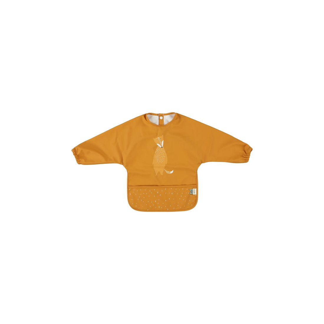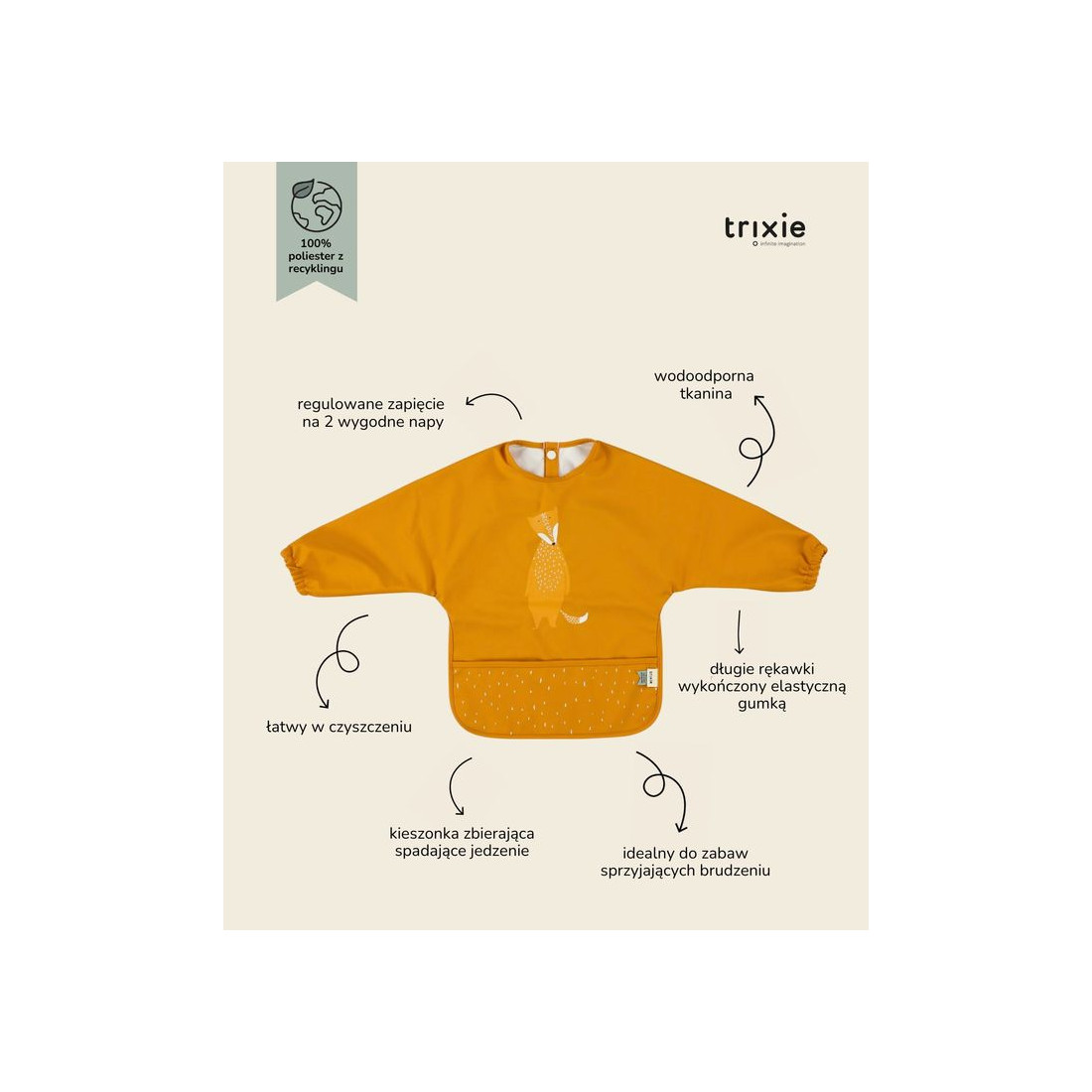 Ten wesoły śliniaczek ma praktyczne długie rękawki i utrzymuje ubrania dziecka w czystości w trakcie posiłku. Poręczna kieszeń gwarantuje, że rozsypywana żywność zostanie starannie zebrana, dzięki czemu nie będzie bałaganu. Tkanina jest wodoodporna i wykonana w 100% z poliestru pochodzącego z recyklingu! Można śliniaczek łatwo wyczyścić i zaoszczędzić mnóstwo czasu na praniu lub czyszczeniu.