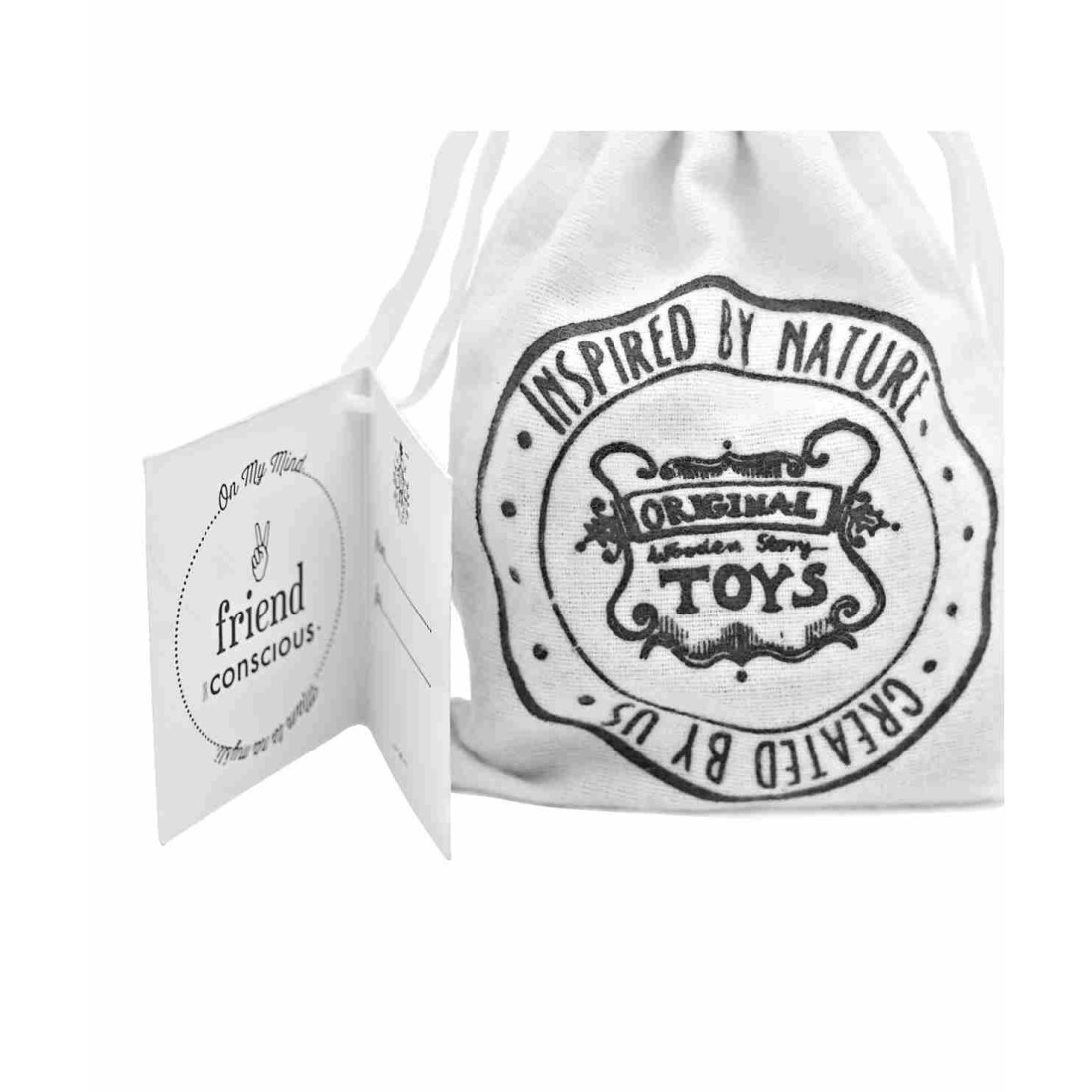 Klocki drewniane Mam to na Myśli… marki Wooden Story to oryginalny i nietuzinkowy sposób na wyrażenie uczuć. Zapakowane w miękki, bawełniany woreczek, stanowią wyjątkowy prezent, zarówno dla siebie, jak i dla bliskiej osoby. W środku znajdują się dwa klocki drewniane z wygrawerowanymi słowami w języku angielskim: Conscious, Friend oraz trzeci z symbolem zwycięstwa. Te wyjątkowe klocki pozwolą Ci wyrazić to, co trudno przekazać słowami – idealne na prezent, który trafi prosto do serca. Możesz je także postawić w swoim ulubionym miejscu, by codziennie przypominały Ci, co naprawdę ma znaczenie. Do woreczka dołączony jest bilecik z napisem „Mam to na myśli” oraz miejsce na osobisty podpis, co sprawia, że klocki stają się wyjątkowym, spersonalizowanym podarunkiem.